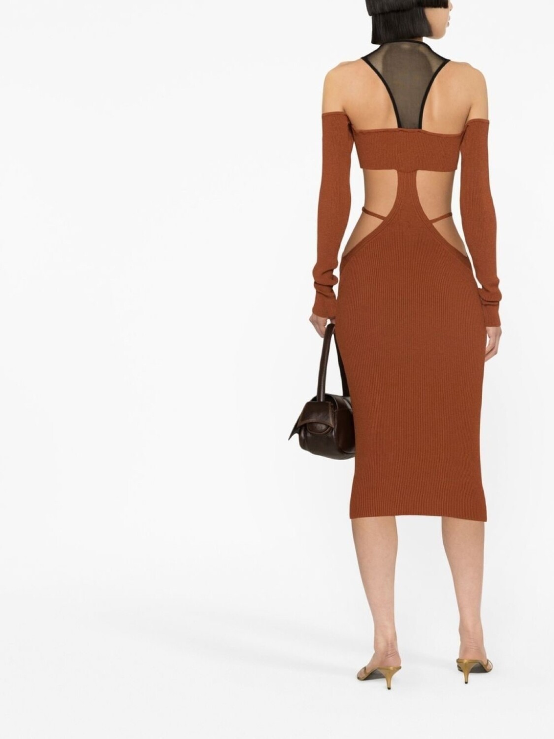 Коричневый, черный, трикотаж в рубчик, эластичный материал, вырезные детали, вырез-петля халтер и длинные рукава.