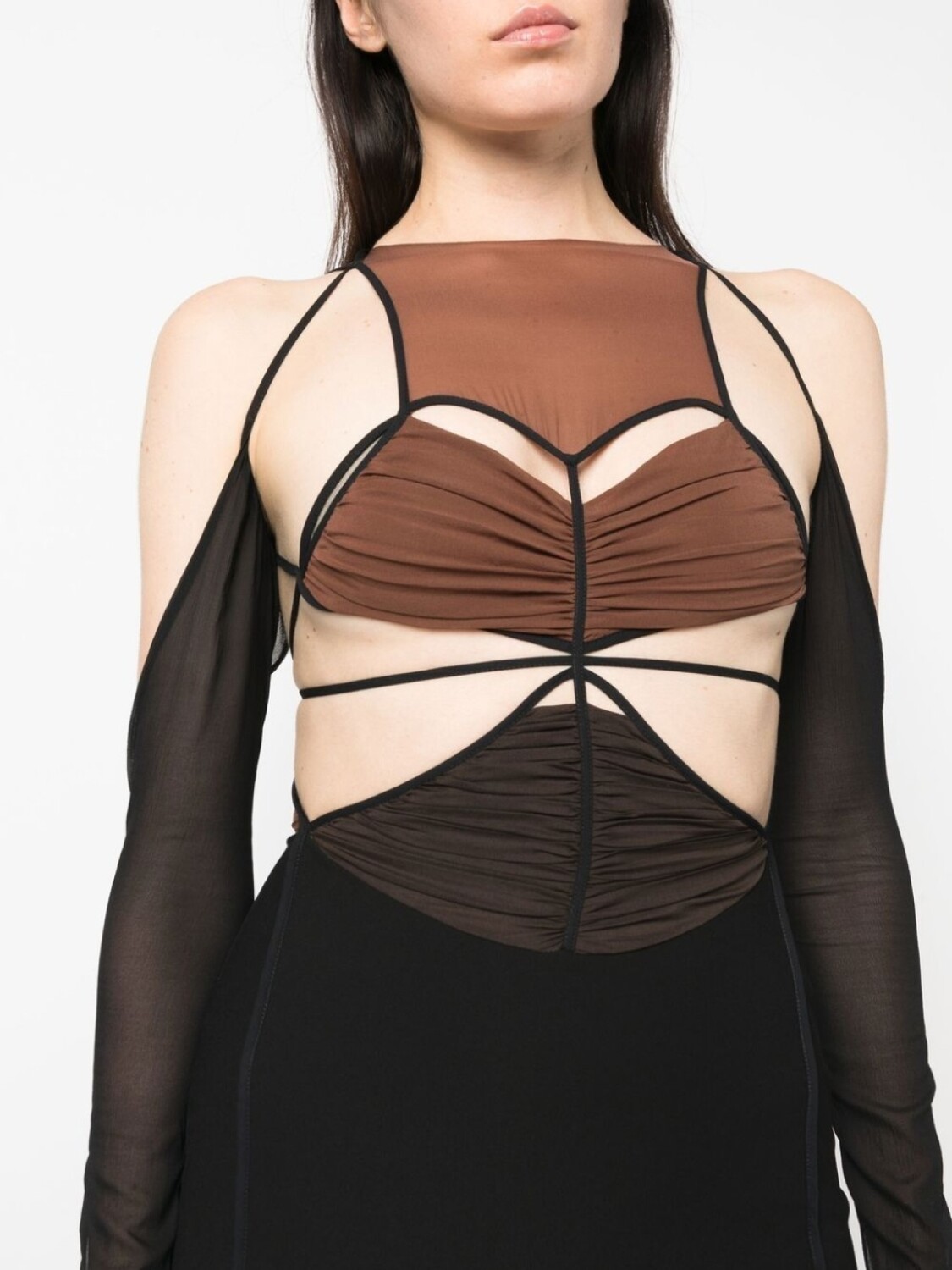 Черный, коричневый, эластичный шелк, вырезные детали, дизайн со сборками, открытые плечи, высокий воротник, длинные рукава и длина до бедер.