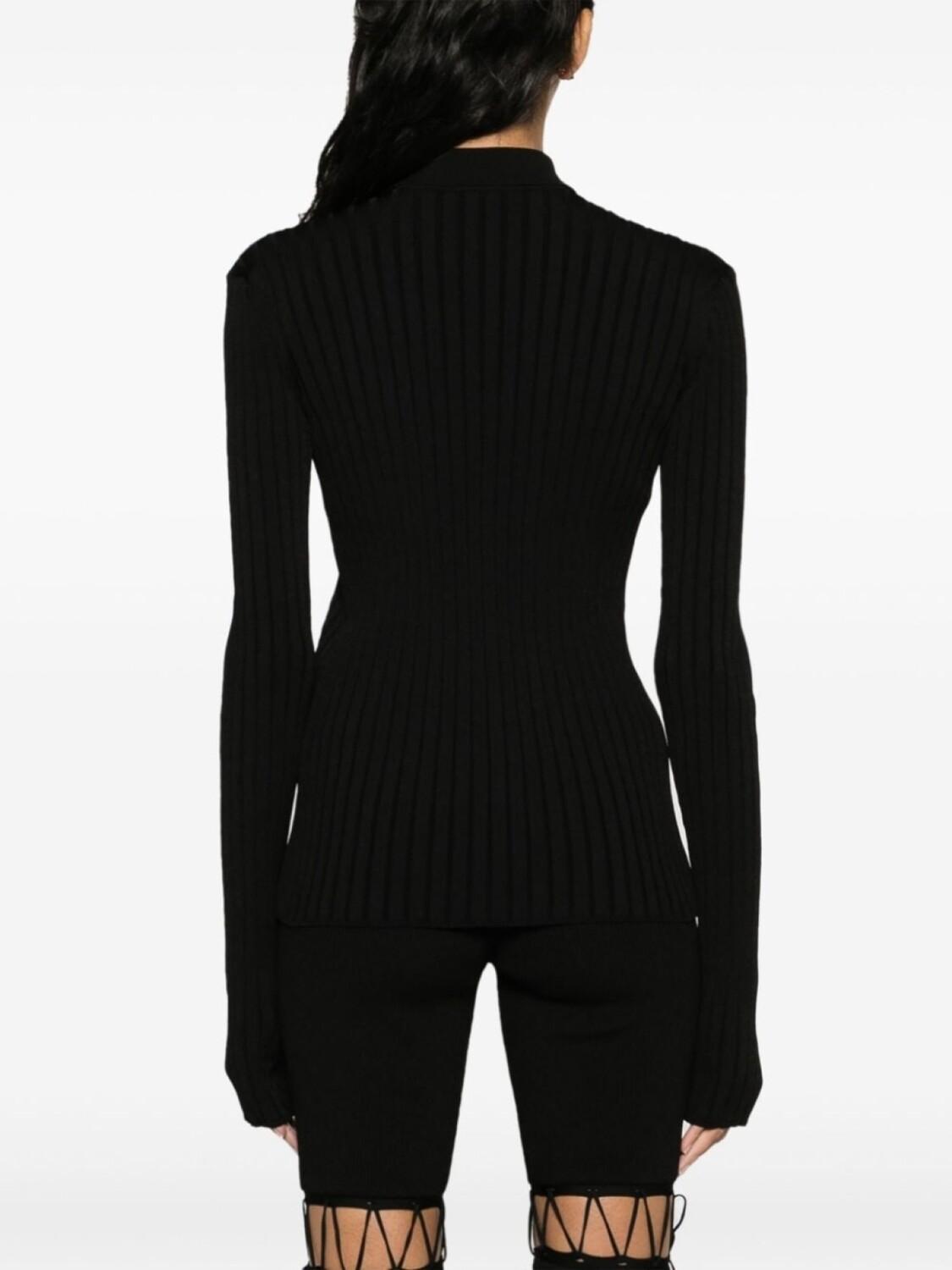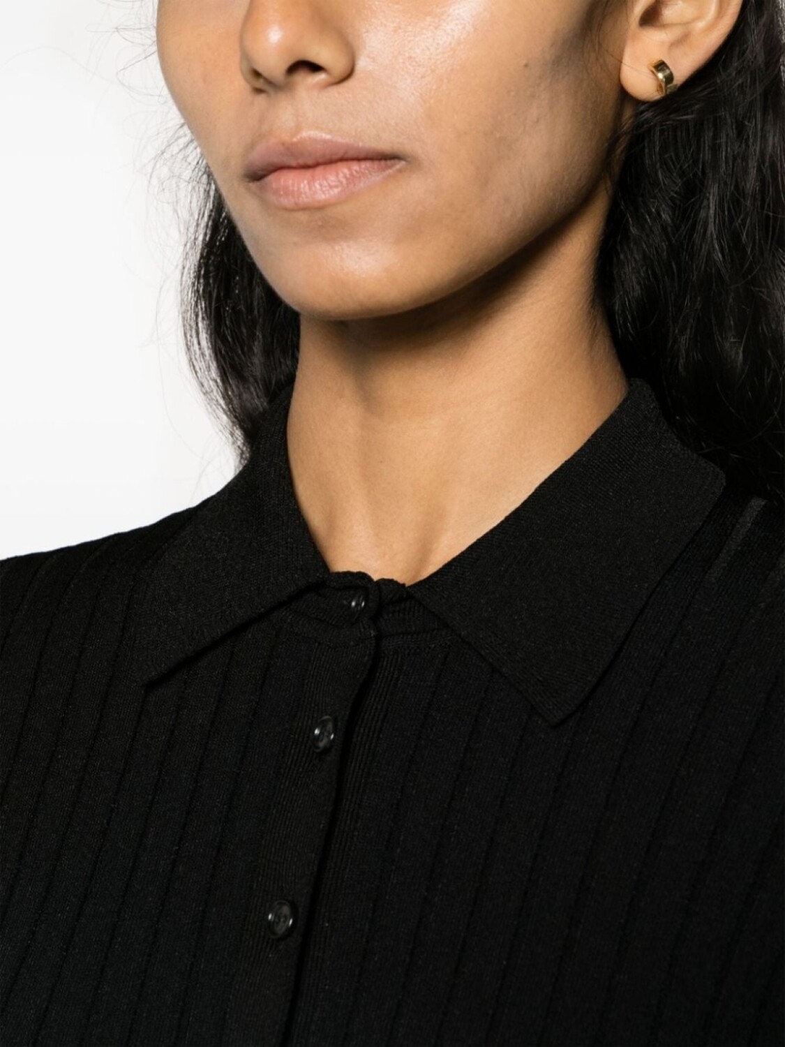 Черный, трикотаж в рубчик, прямой воротник, застежка на пуговицах спереди, длинные рукава и подол с фестонами.
