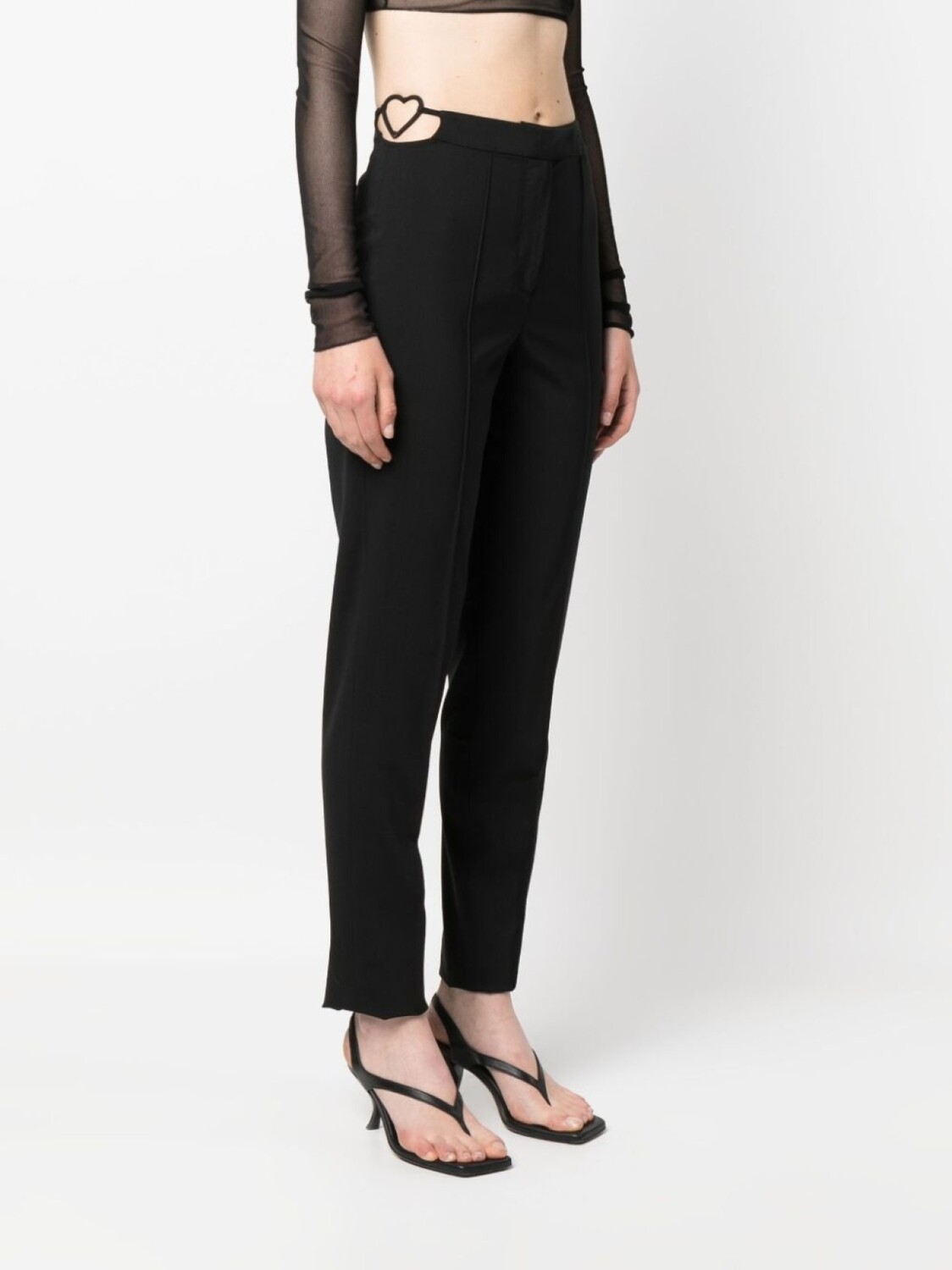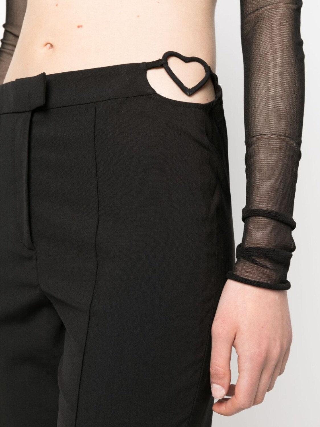 Черный, смесовая необработанная шерсть, эластичный материал, вырезные детали, огранка «сердце», средняя посадка, стрелки, потайная застежка спереди, прорезной карман на пуговице сзади и узкий крой.