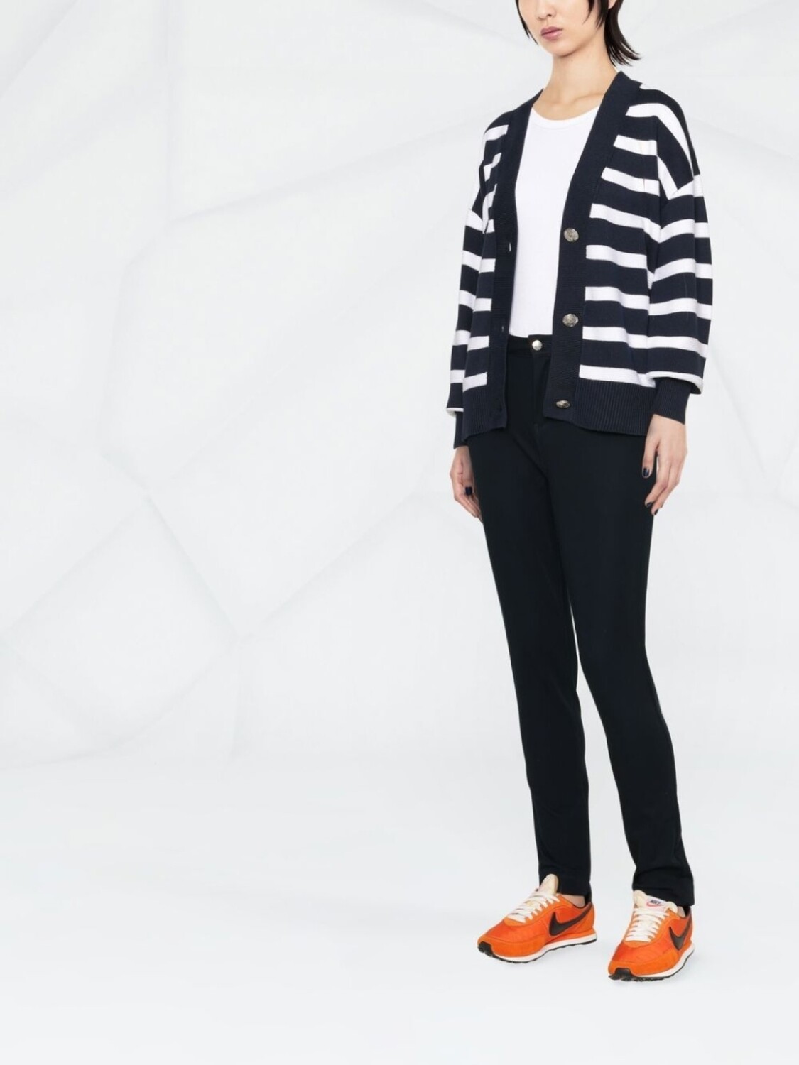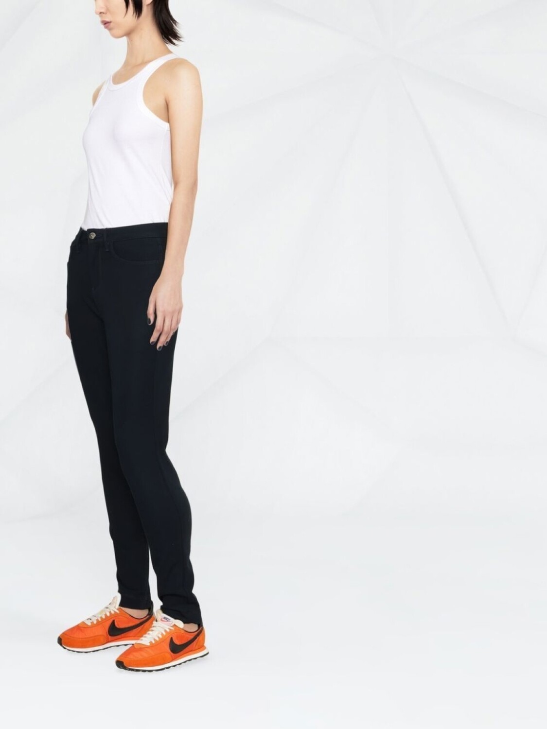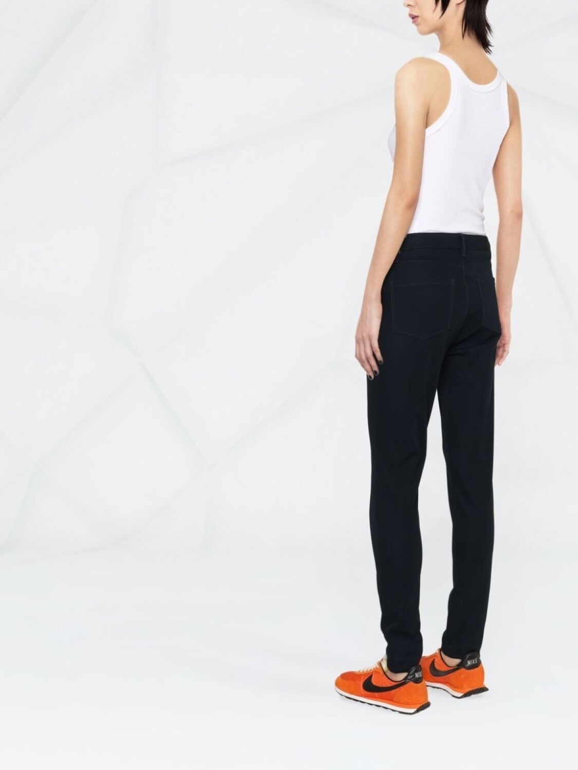 Темно-синий, эластичный материал, отделка лентой с логотипом, средняя посадка, петли для ремня, потайная застежка спереди, пять карманов и узкий крой.