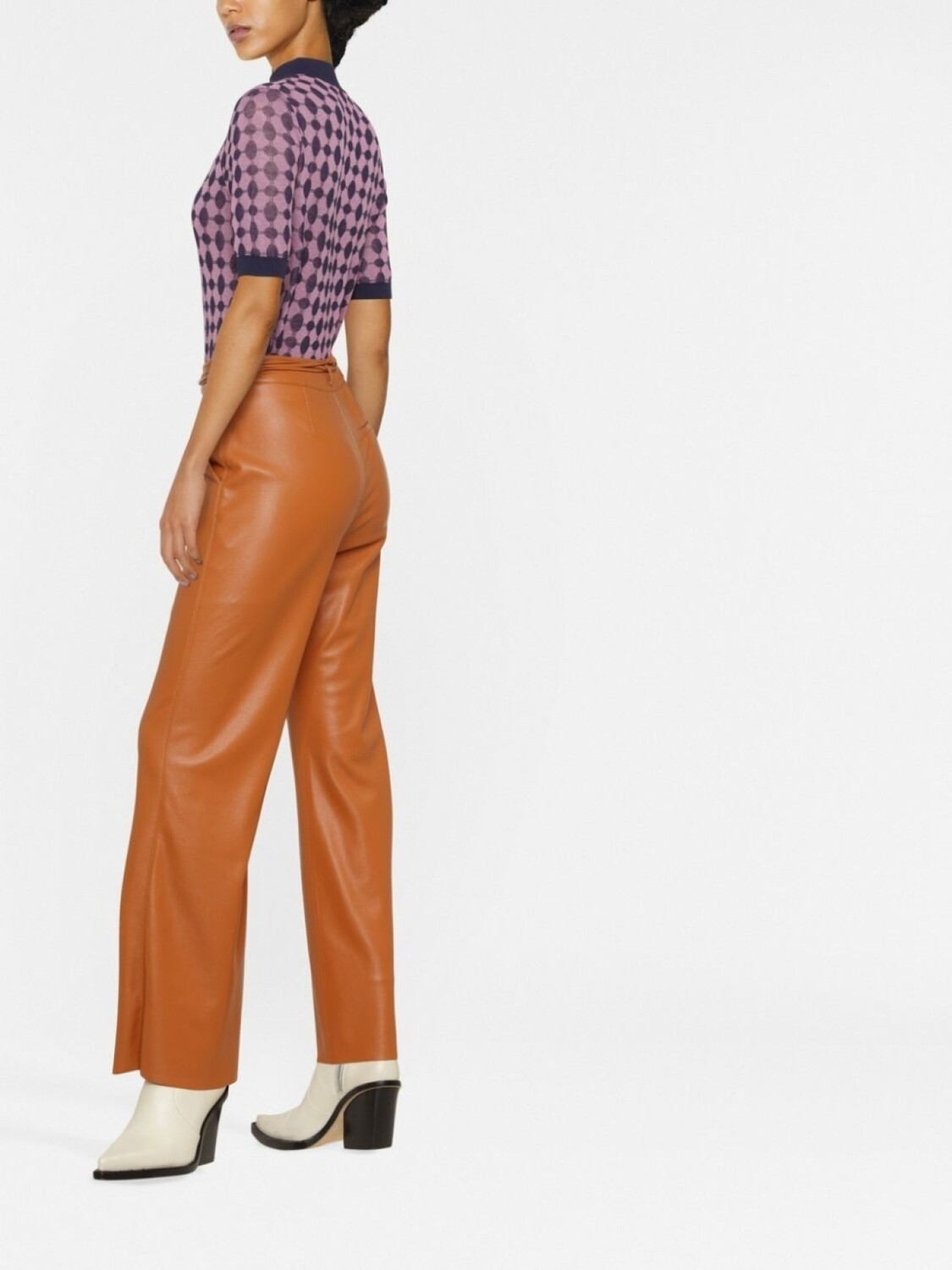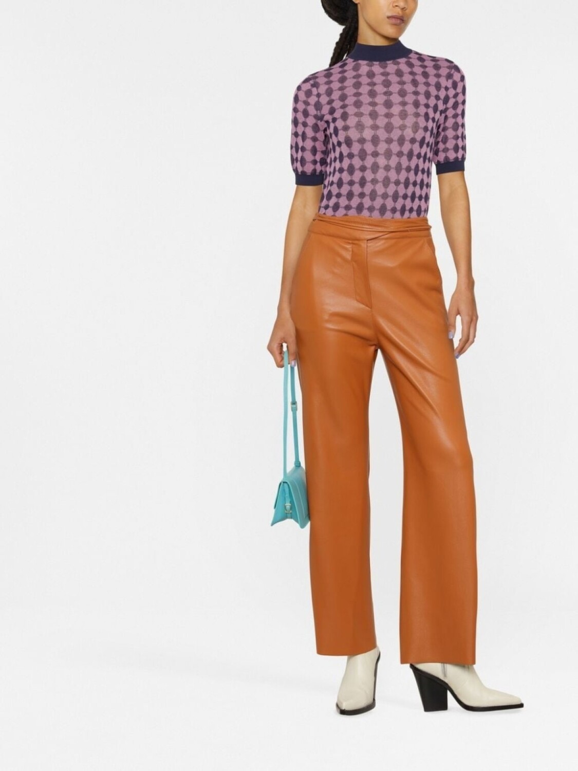 Фиолетовый, темно-синий, смесовый хлопок, тонкая вязка, геометричный узор, высокий воротник, короткие рукава, прямой подол и вязаные края в рубчик.