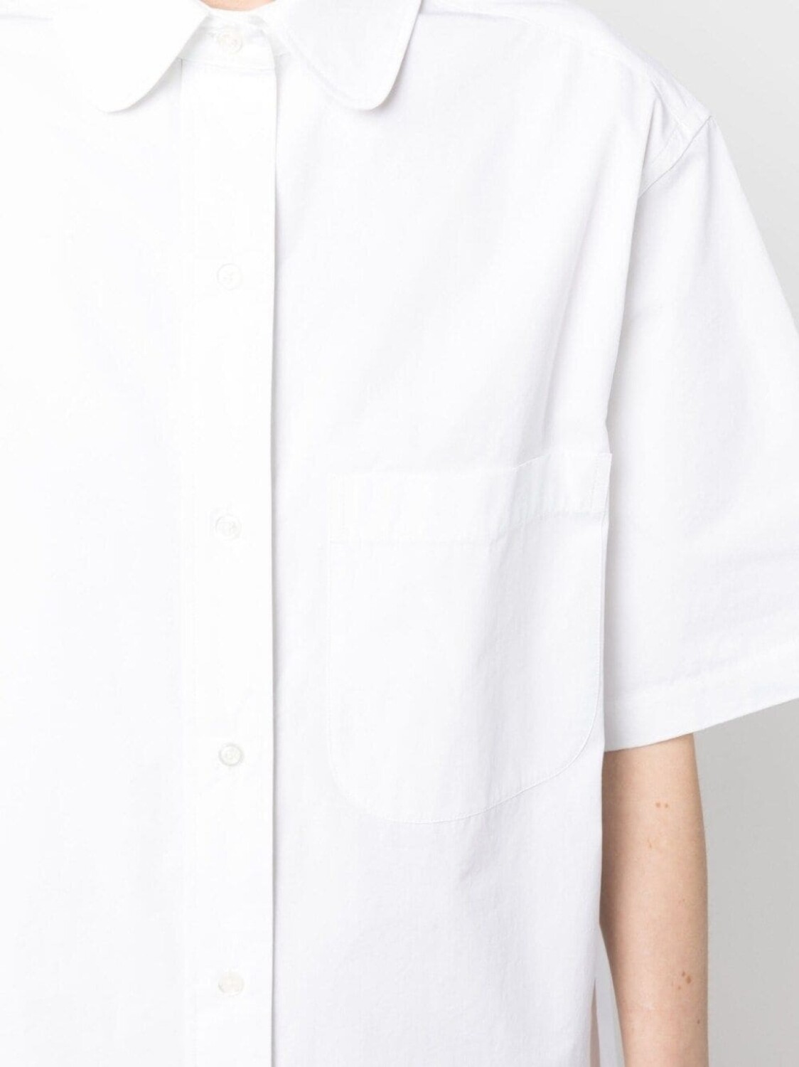 Белый, хлопок, поплин, нашивка с логотипом спереди, знаковая деталь в полоску, дизайн со сборками, классический воротник, застежка на пуговицах спереди, короткие рукава и длина выше колена.