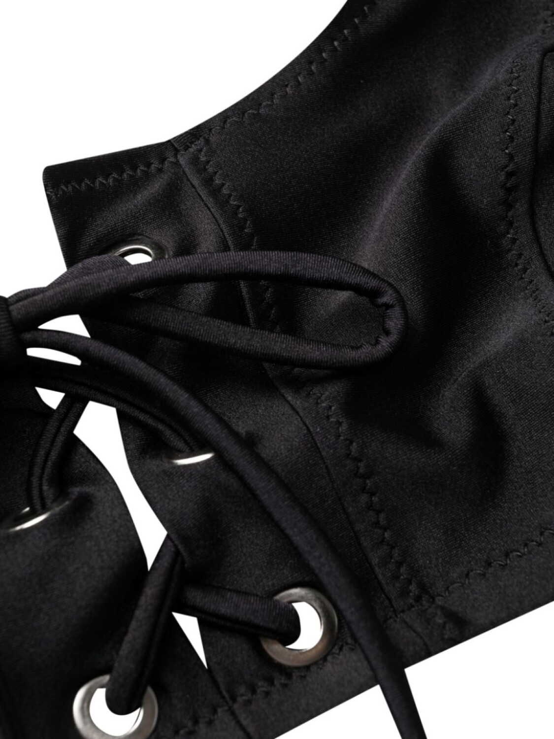 Эластичная модель, перекрестные ремешки, тональная строчка, широкое горлышко, завязки спереди, завышенная талия и завязки по бокам. Цвет: черный. Пожалуйста, примеряйте купальники и пляжные шорты только поверх собственного белья.