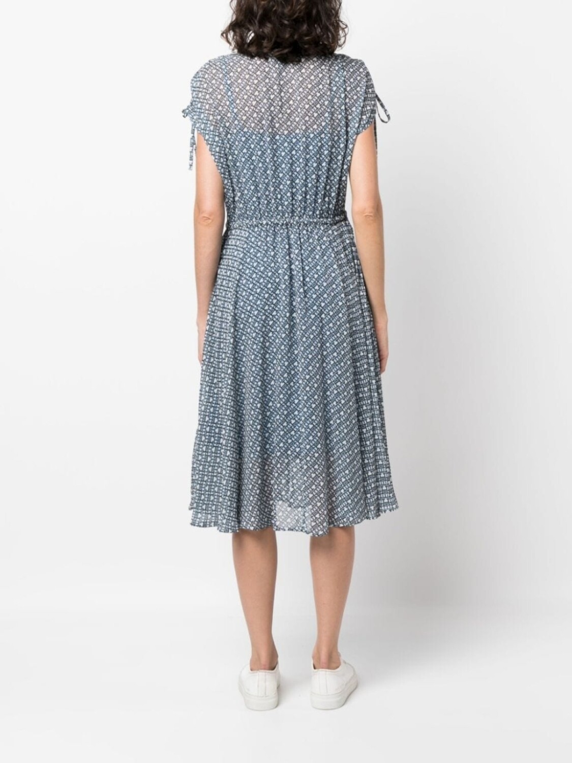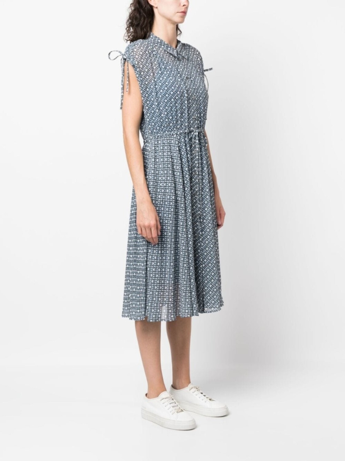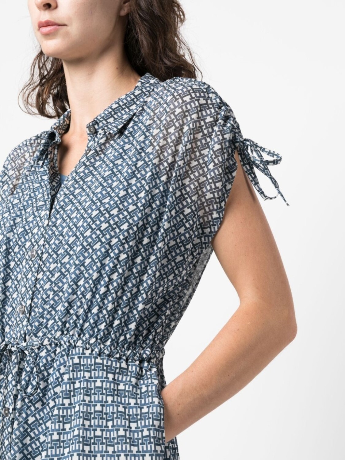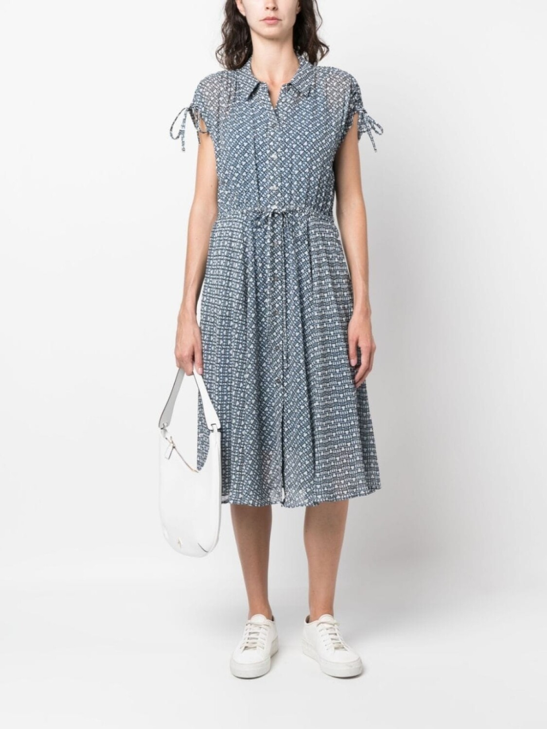 Синий/белый, сплошной принт с логотипом, дизайн со сборками, шифон, отложной воротник, застежка на пуговицах спереди, ремень на талии, короткие рукава, длина ниже колена и прямой подол.