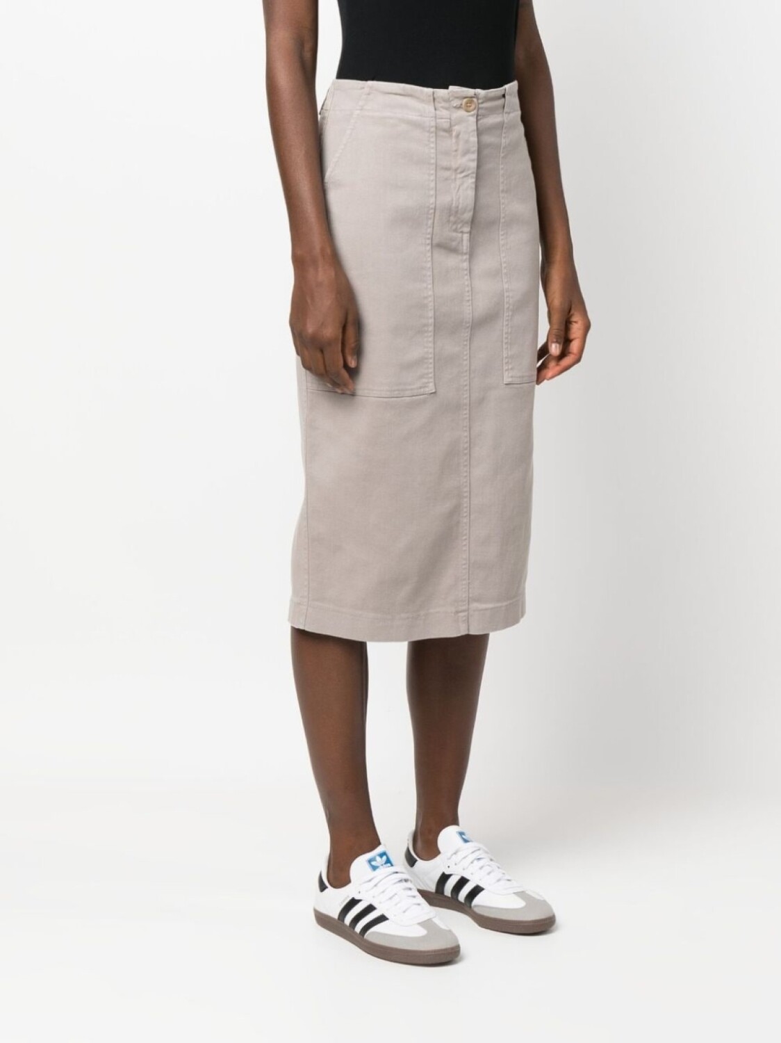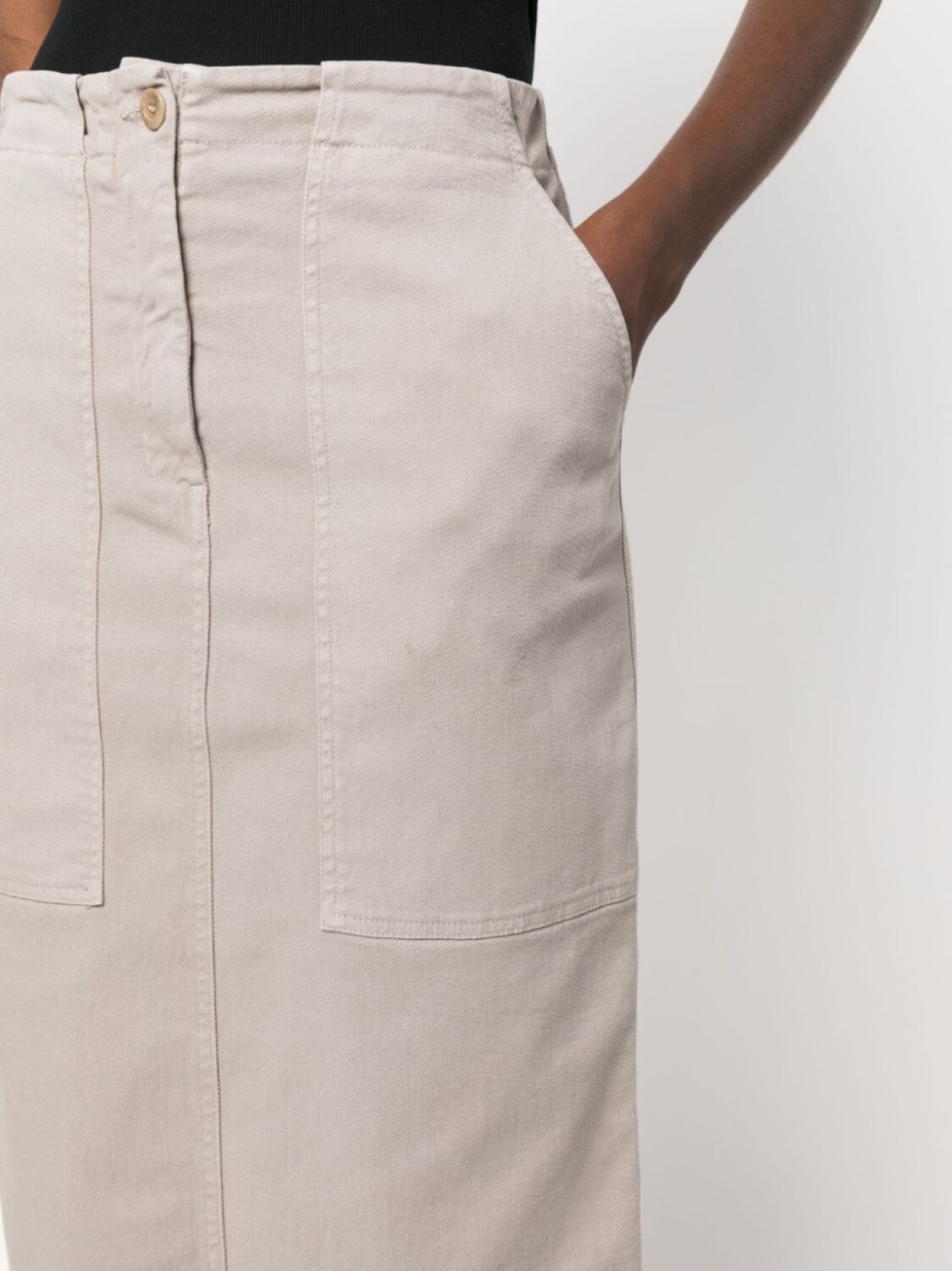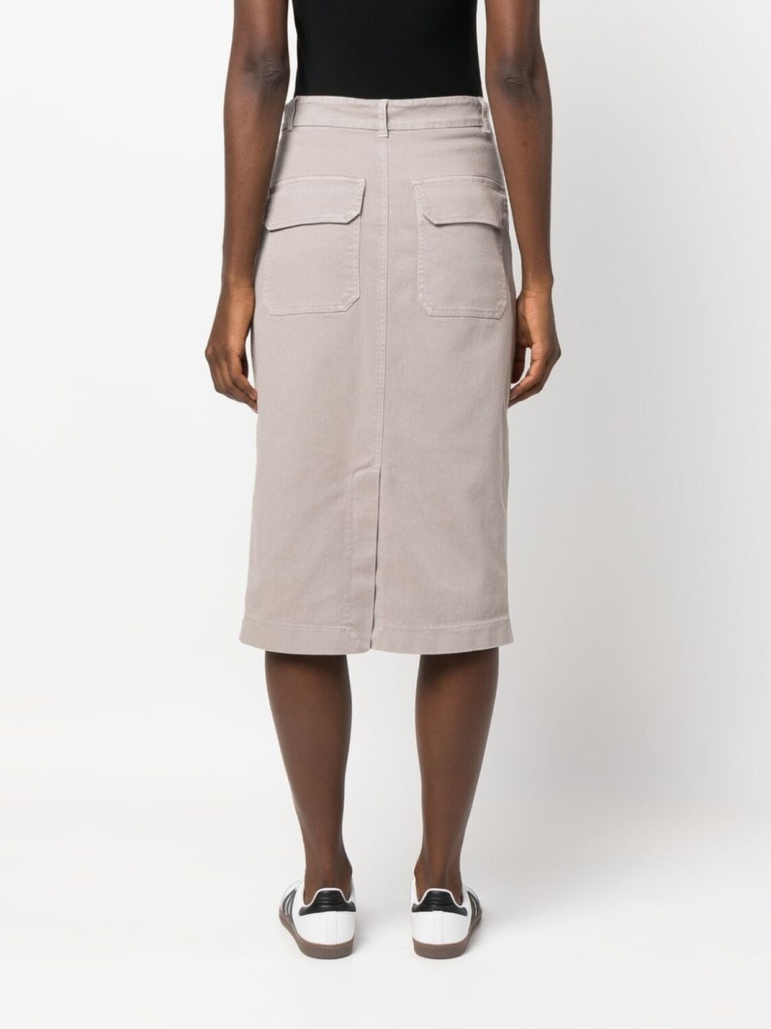 Серо-коричневый, эластичный хлопок, петли для ремня, ширинка на пуговицах, завышенная талия, два накладных кармана спереди, два кармана с клапанами сзади, вырез сзади, прямой подол и длина миди.