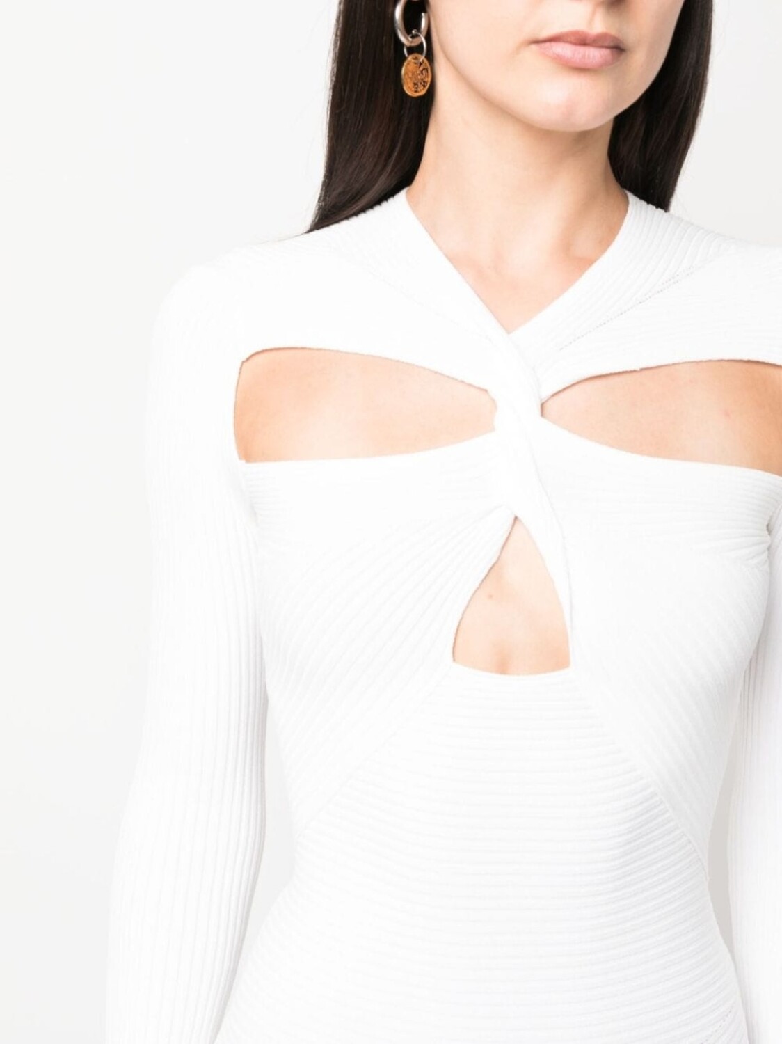 Белый, ткань в мелкий рубчик, перекрученная деталь, вырезные детали, V-образный вырез, длинные рукава и длина до бедер.