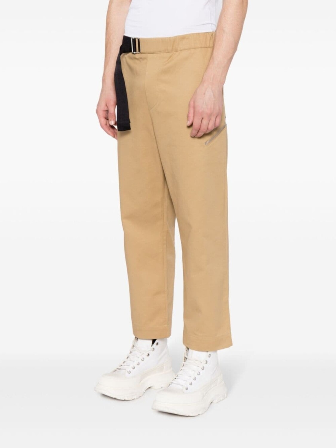 Golden brown, cotton, tapered leg, cropped, side buckle fastening, side zip-fastening pocket, elasticated waistband, rear welt pocket