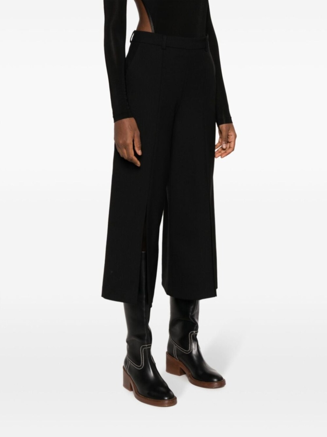 Черный, золотистый металлический логотип, завышенная талия, петли для ремня, ремень на талии, два прорезных кармана по бокам, широкий крой, разрез спереди и укороченная длина.