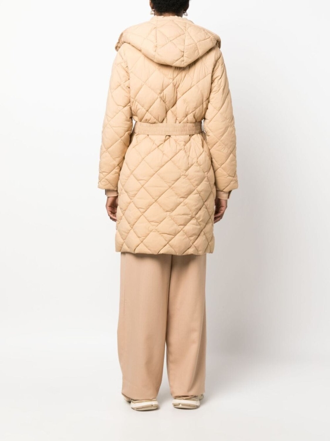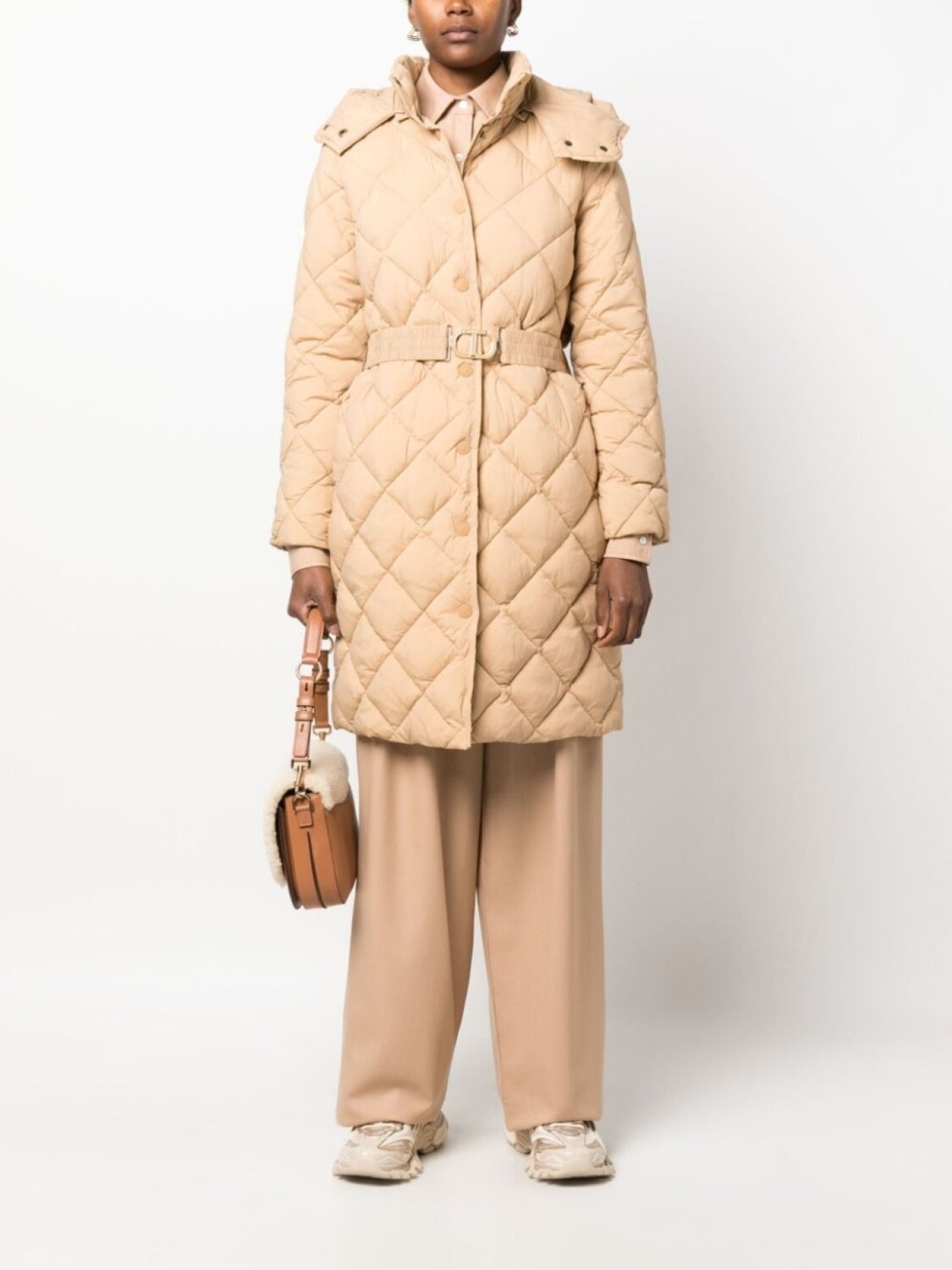 Песочно-бежевый, стеганый узор в ромб, нашивка с логотипом сзади, классический капюшон, высокий воротник, длинные рукава, застежка на кнопках спереди, два передних кармана с листочкой, манжеты на пуговицах, длина по колено и прямой подол.