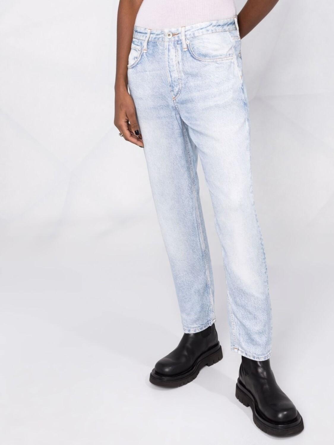 Эффект потертости, низкая посадка, зауженный крой, петли для ремня, потайная застежка спереди и классическая пятикарманная модель.