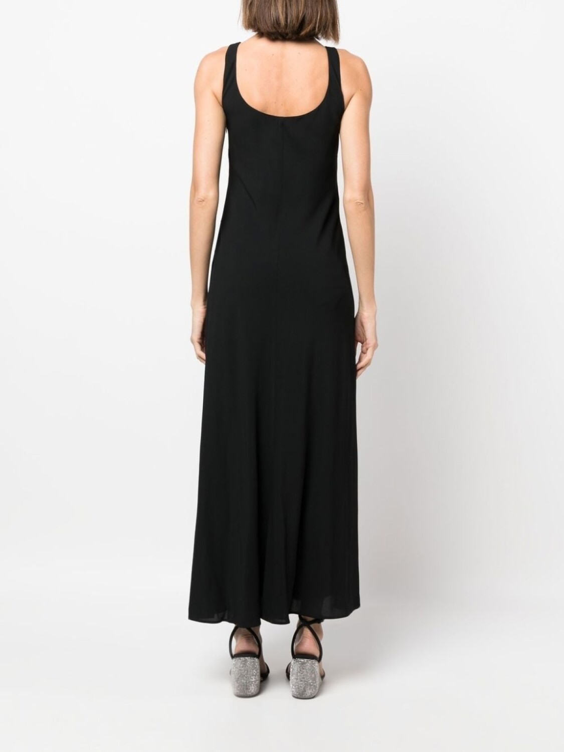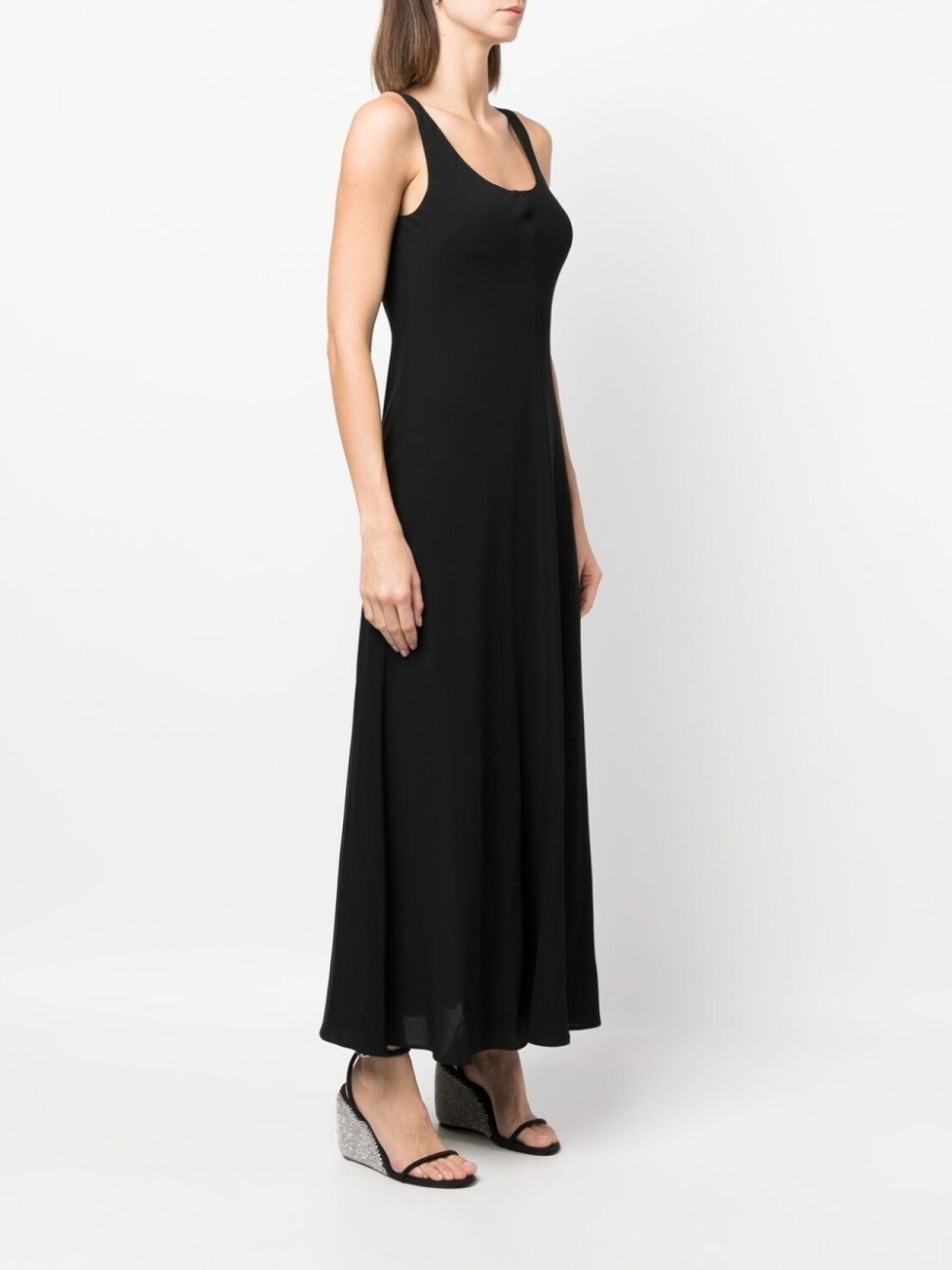 U-образный вырез, без рукавов, расклешенный крой, длинная модель и прямой подол.