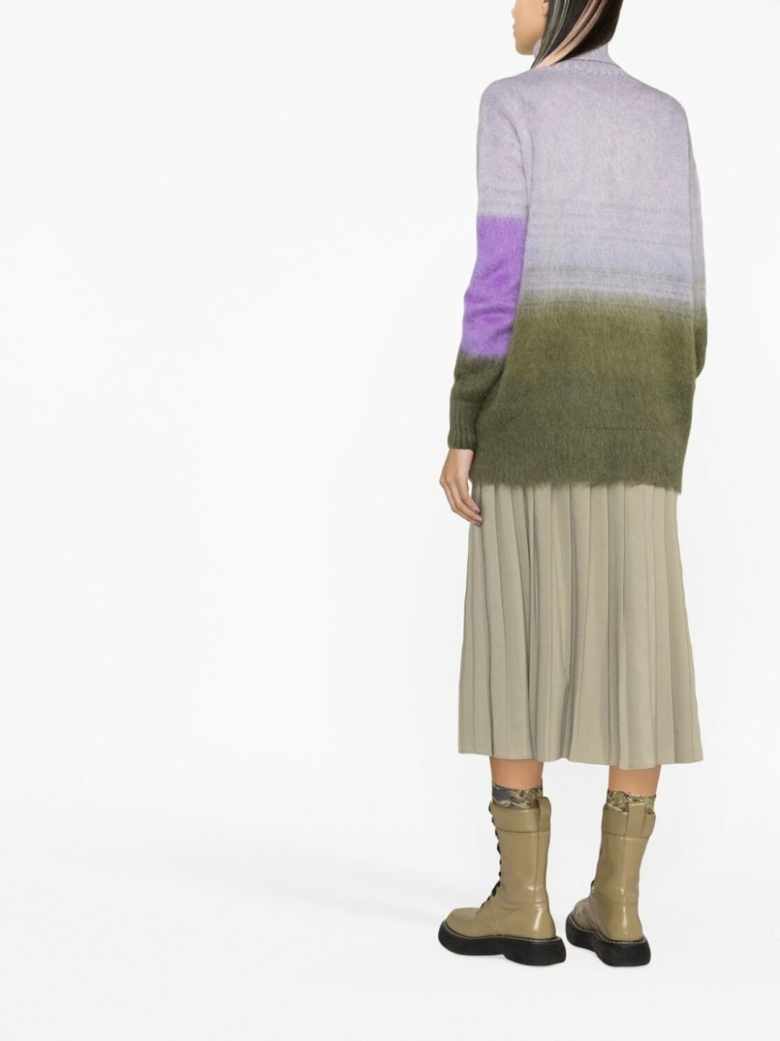 Сирень, мохер, логотип в технике интарсия, высокий воротник и длинные рукава.