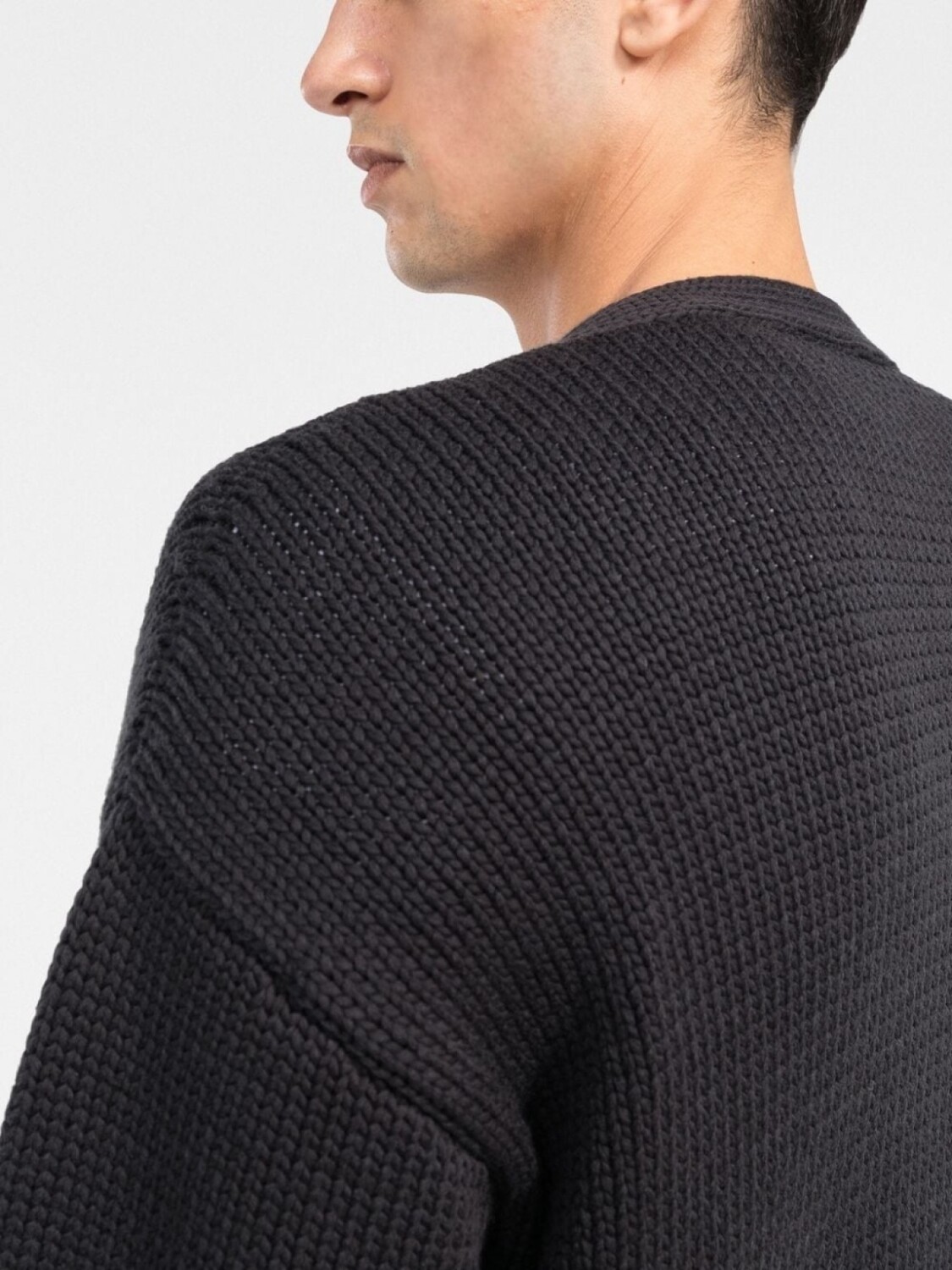 Вафельная вязка, логотип в технике интарсия, застежка на пуговицах спереди, V-образный вырез, длинные рукава, прямой подол и края в рубчик.