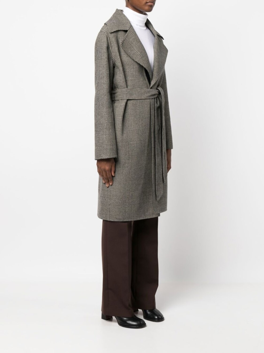 Черный/белый, шерсть, клетчатый узор, широкие зазубренные лацканы, ремень на талии, длинные рукава и прямой подол.