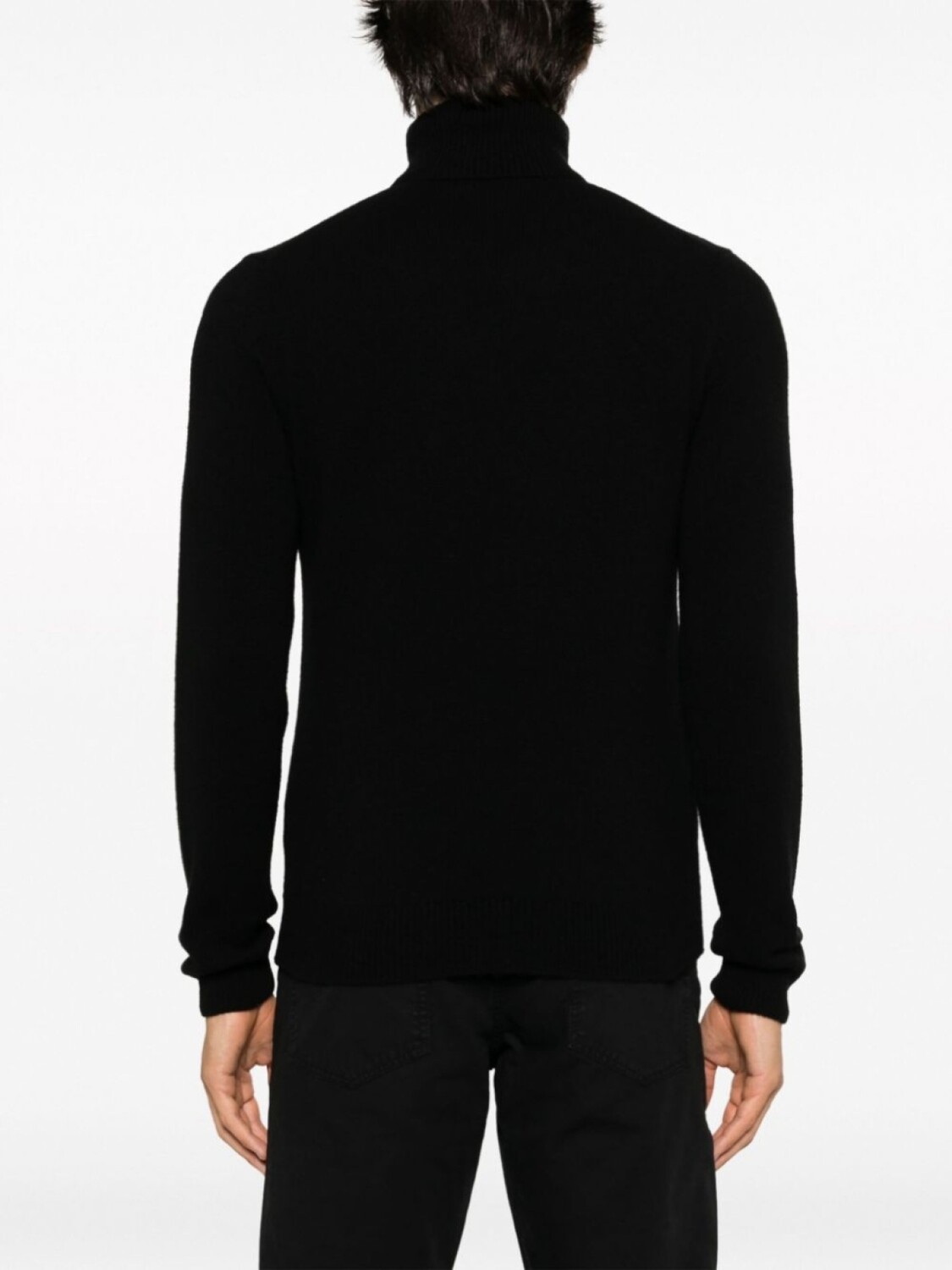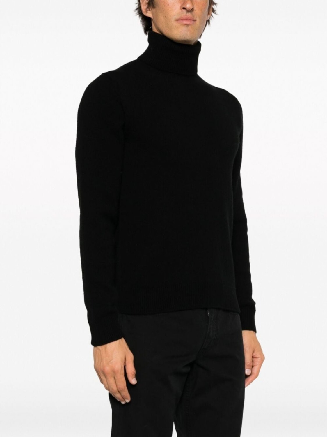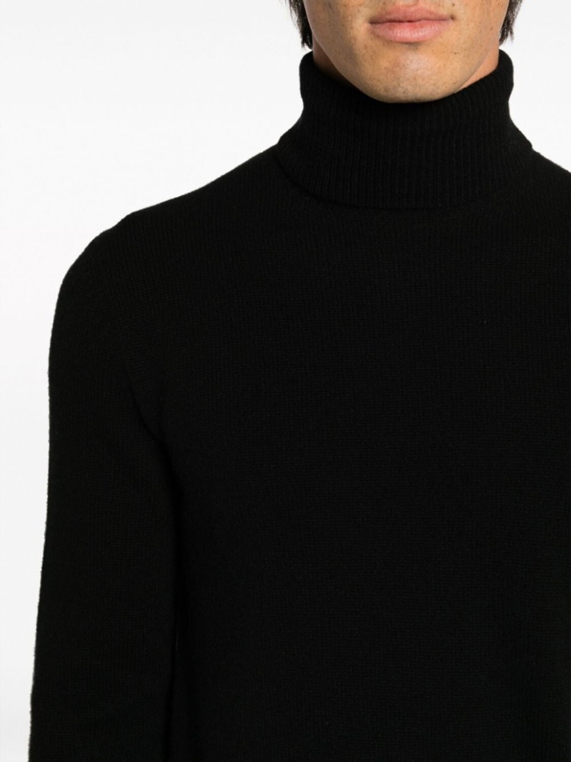 Jet black, cashmere, ribbed knit, roll neck, long sleeves, ribbed cuffs and hem, straight hem