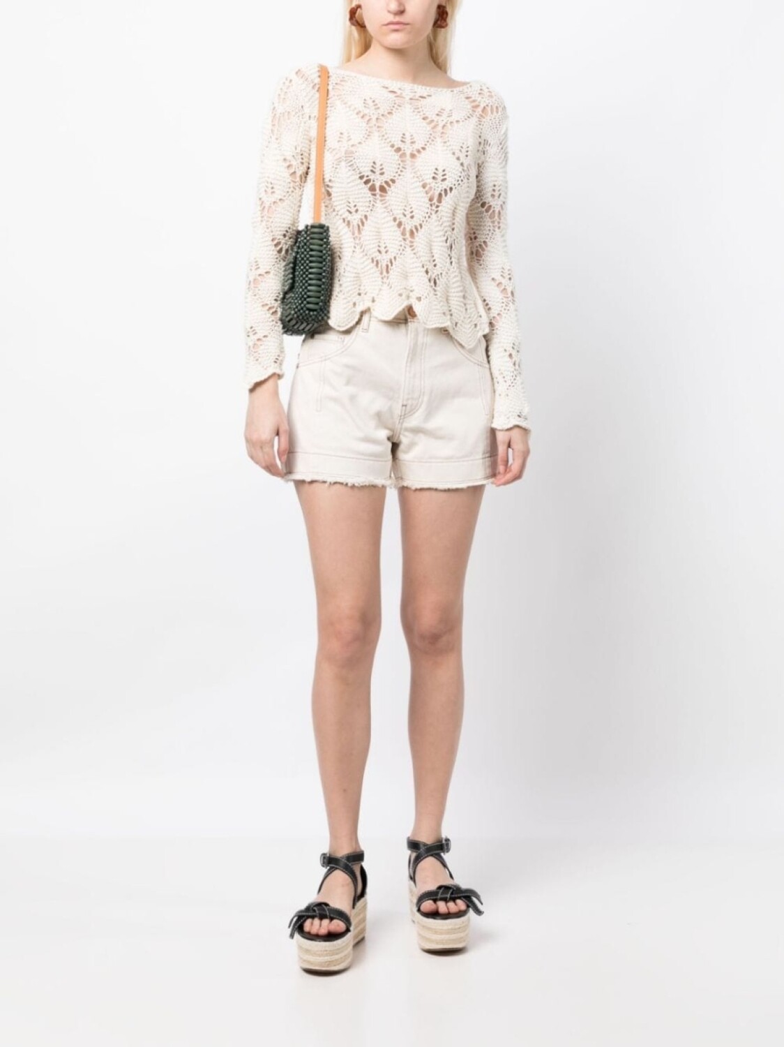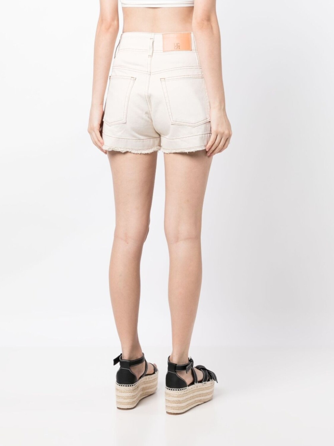 Кремово-белый, хлопок, контрастная строчка, нашивка с логотипом сзади, петли для ремня, ширинка на пуговицах, завышенная талия, широкий крой, два кармана по бокам, два накладных кармана сзади, необработанный подол и длина до бедер.