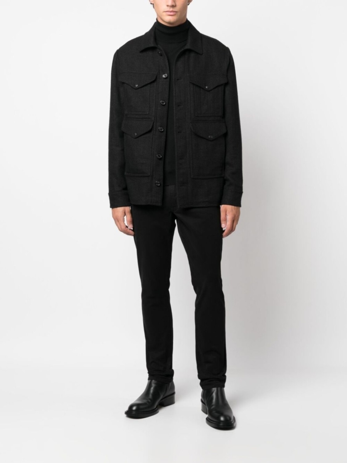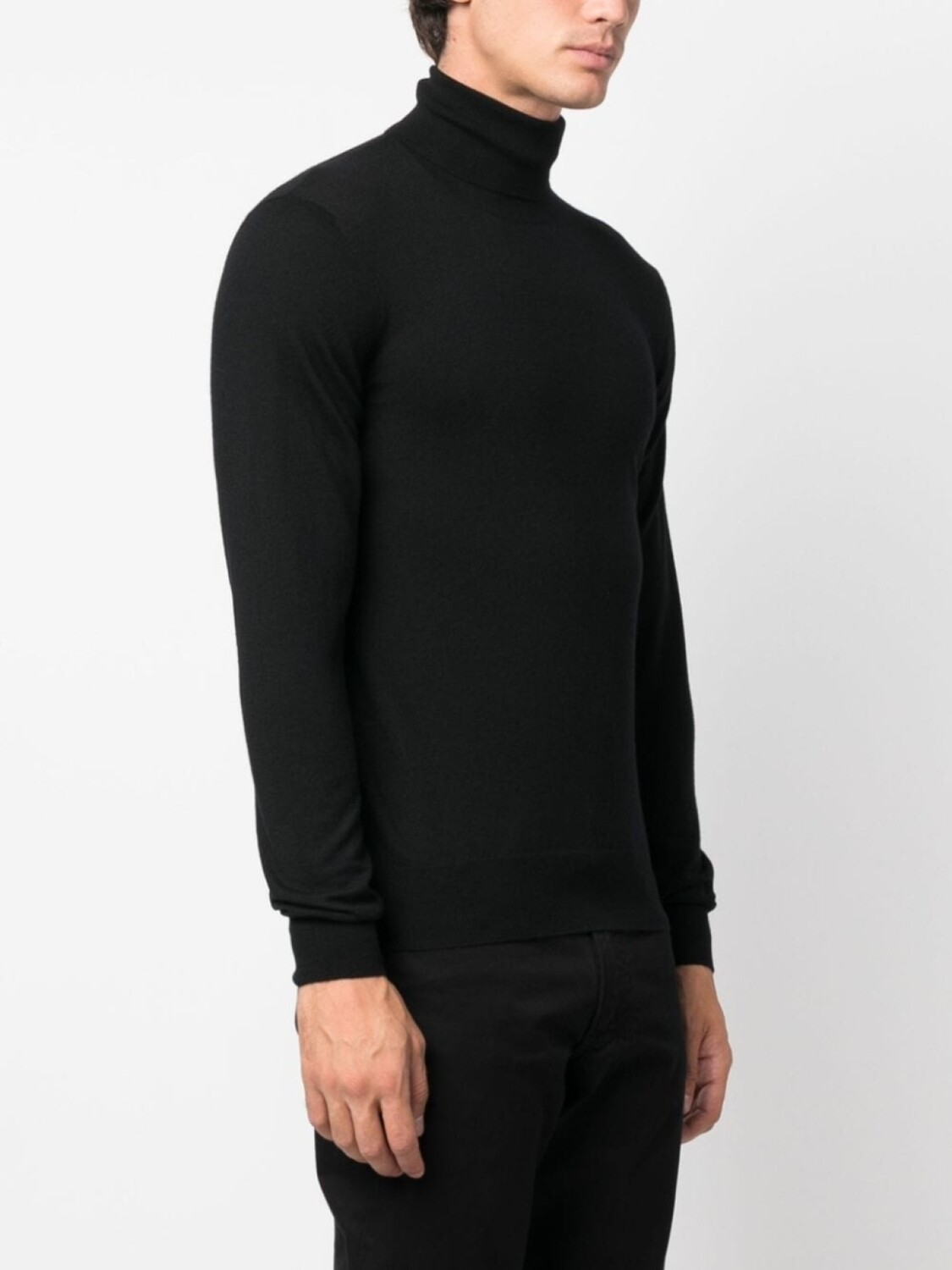 Черный, кашемир, трикотажный материал, высокий воротник, длинные рукава и прямой подол.