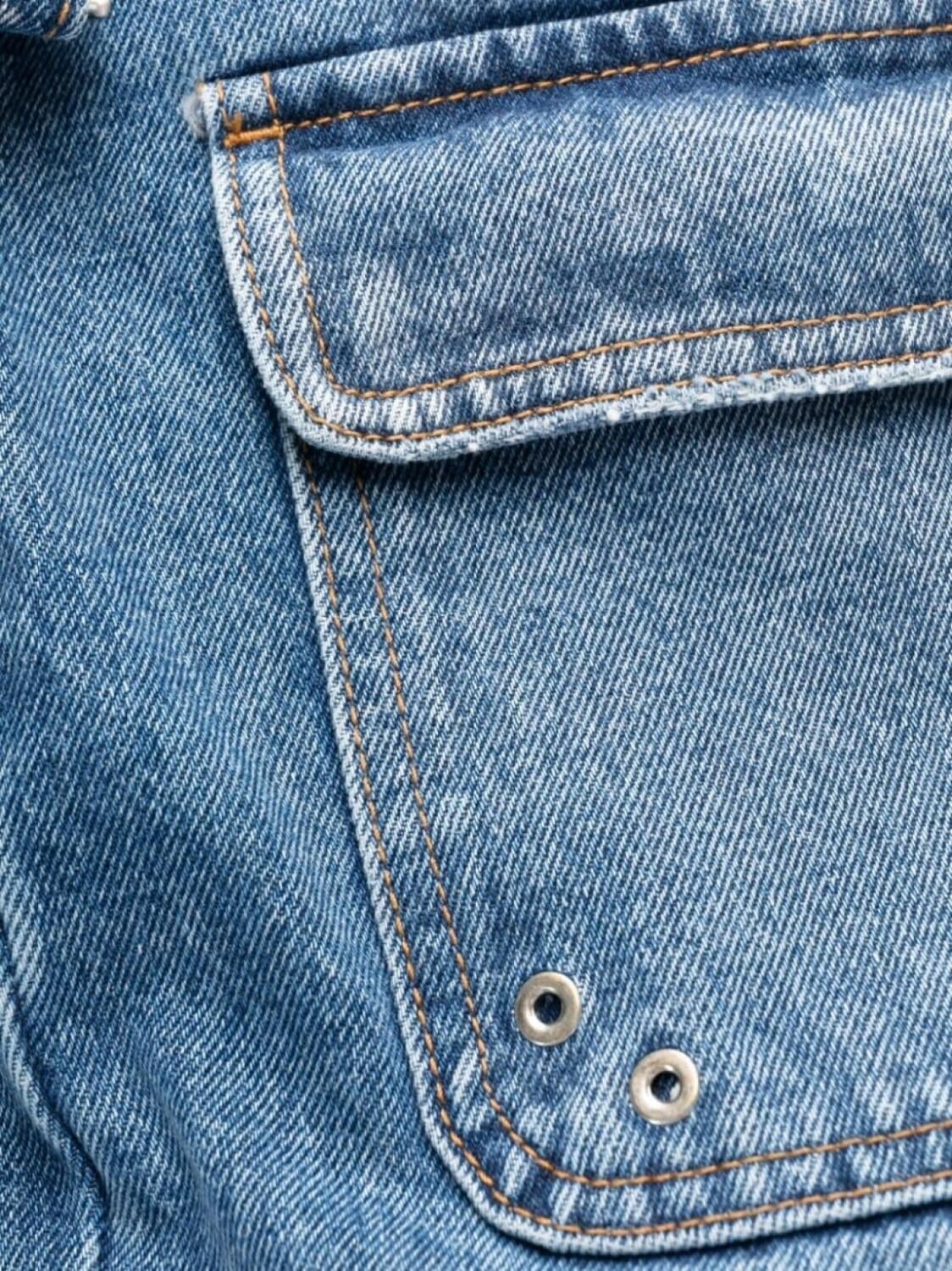 Синий, хлопок, эффект потертости, ремешки, накладные карманы, потайная застежка на молнии и пуговицах, петли для ремня, пять карманов и прямой крой.