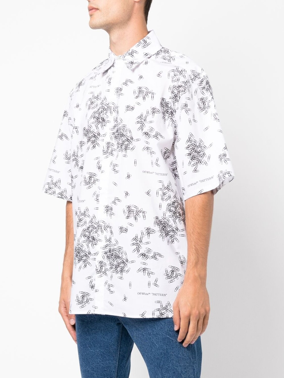 Декор в виде скрепки, классический воротник, застежка на пуговицах спереди и короткие рукава.