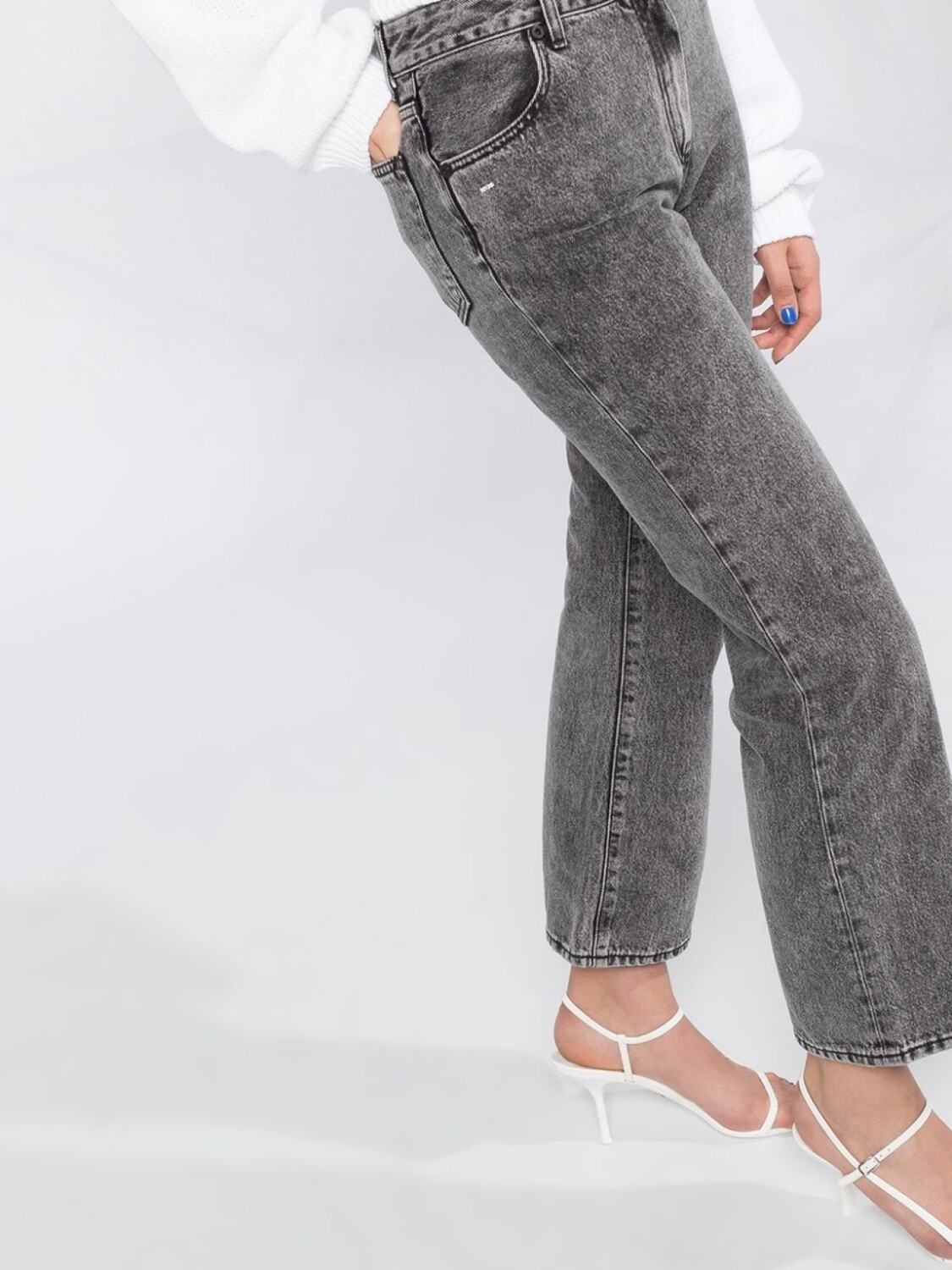 Укороченные джинсы средней посадки от Off-White. Размытый кислотный принт, застежка на пуговицах спереди, пояс с петлями для ремня, классическая пятикарманная модель, расклешенный силуэт и укороченная длина. Цвет: серый.