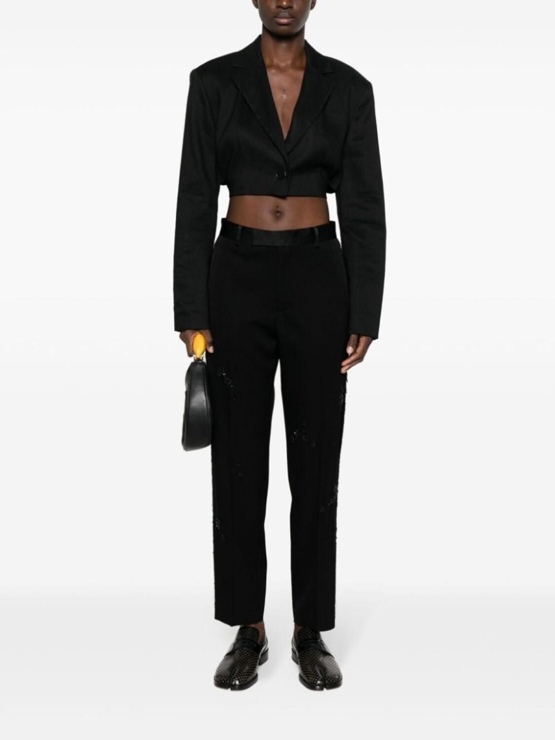 Вышивка, строчка в тон, декор из бисера, складки, потайная застежка спереди, средняя посадка, прямой крой, два прорезных кармана сбоку, два кармана с листочкой сзади, прямой подол и высота по щиколотку.