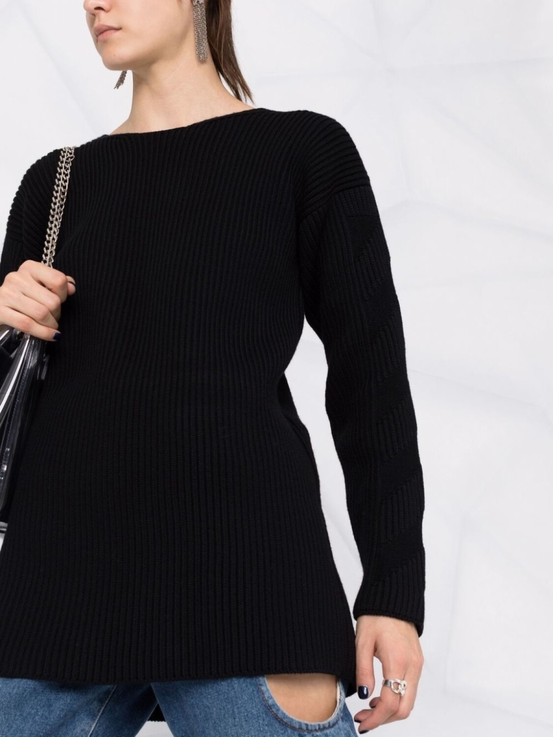 Круглый вырез, детали в рубчик, приспущенные плечи, длинные рукава и прямой подол. Цвет: черный.