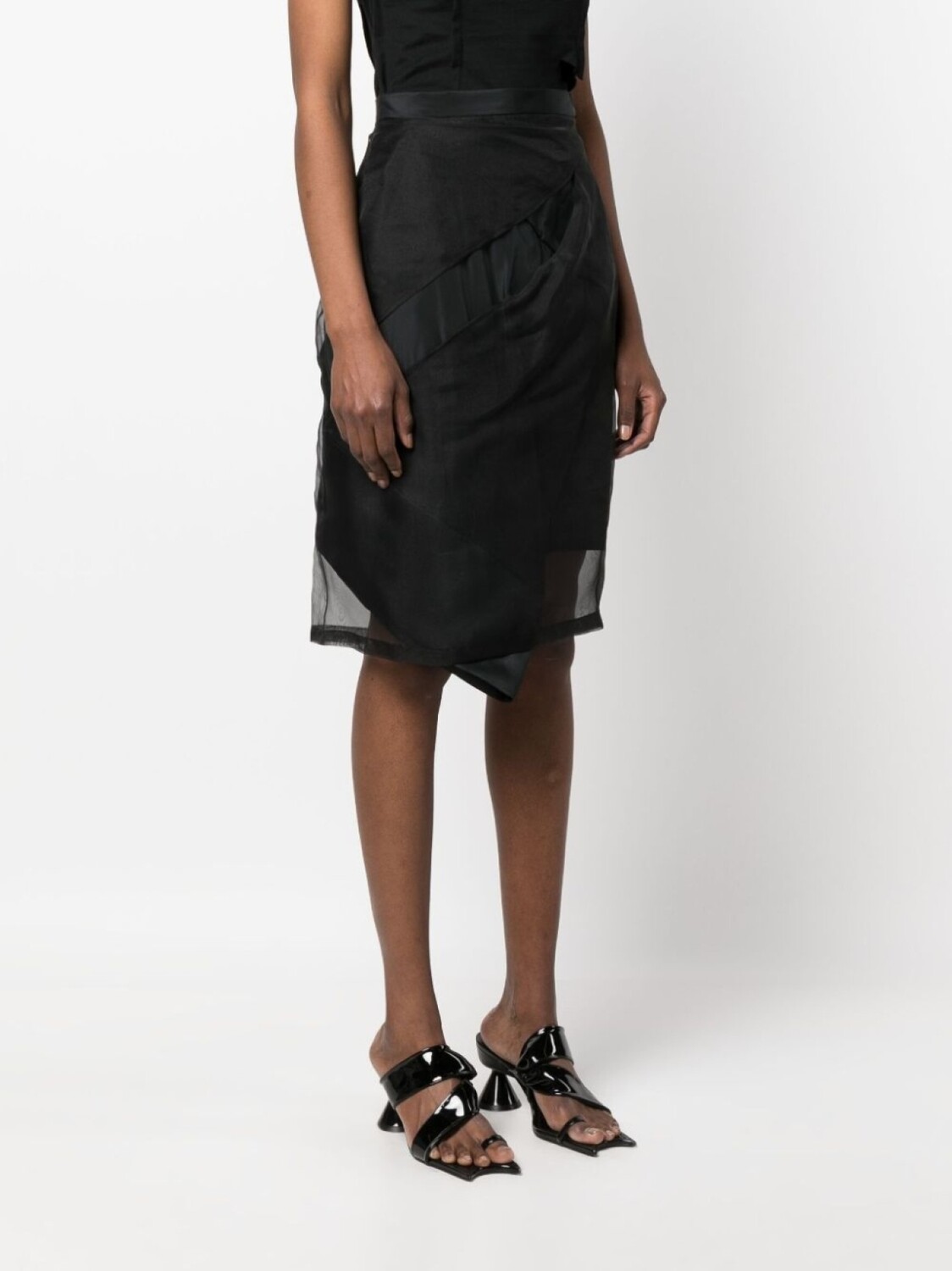 Черный, вставки из тюля, асимметричная форма, завышенная линия талии и потайная застежка сбоку.