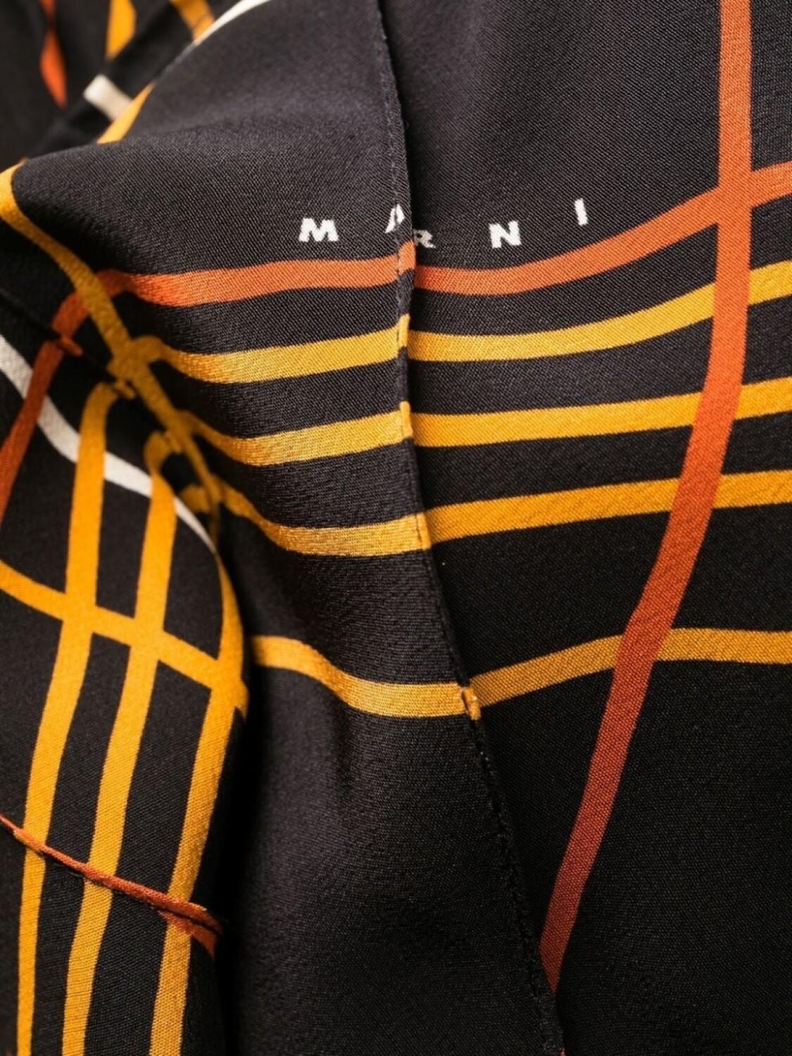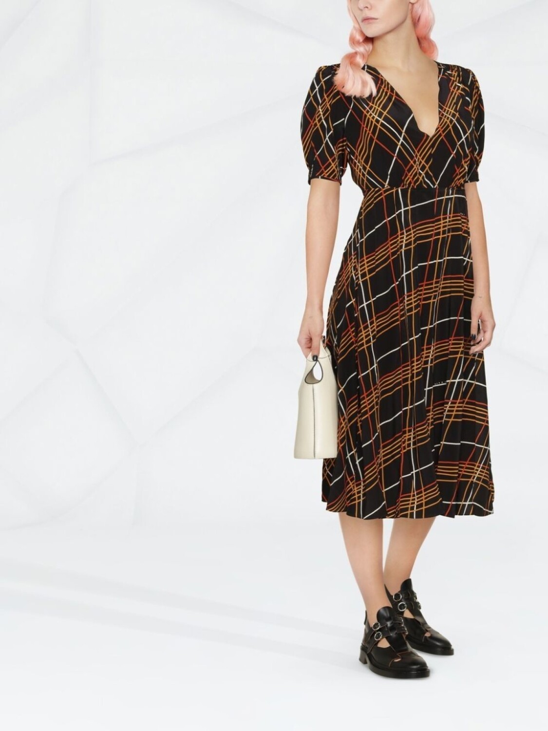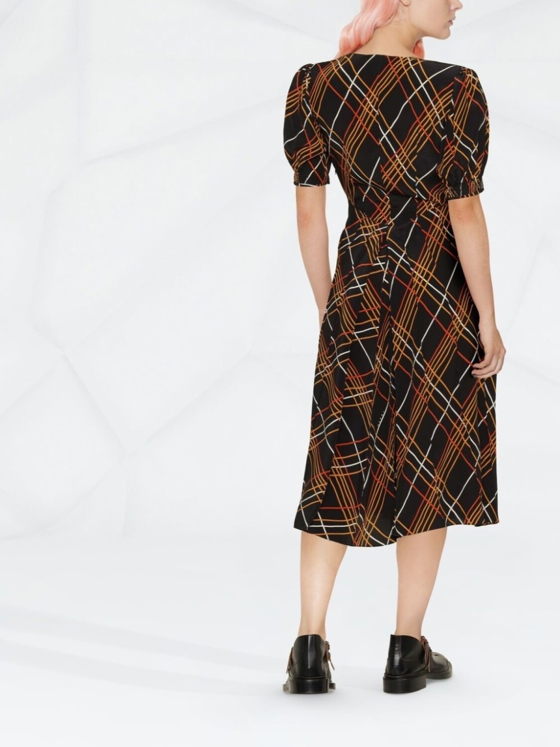 Черный/разноцветный, шелк, V-образный вырез, короткие объемные рукава, узор в полоску нескольких видов и длина миди.