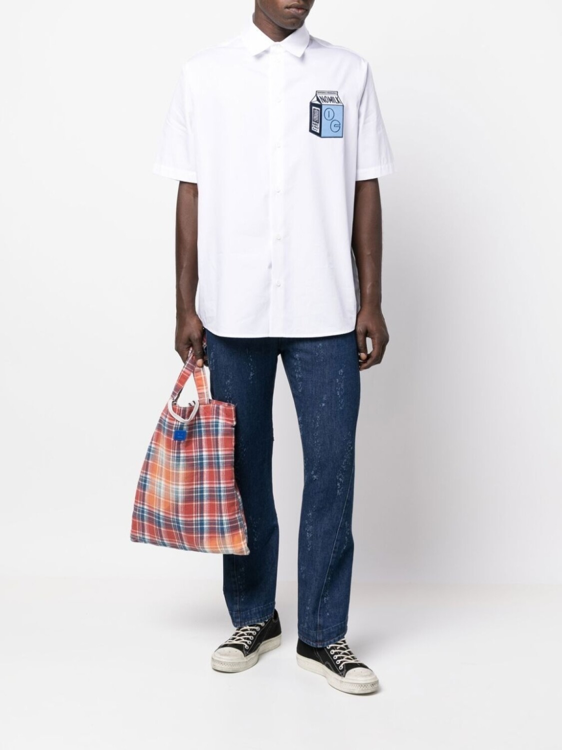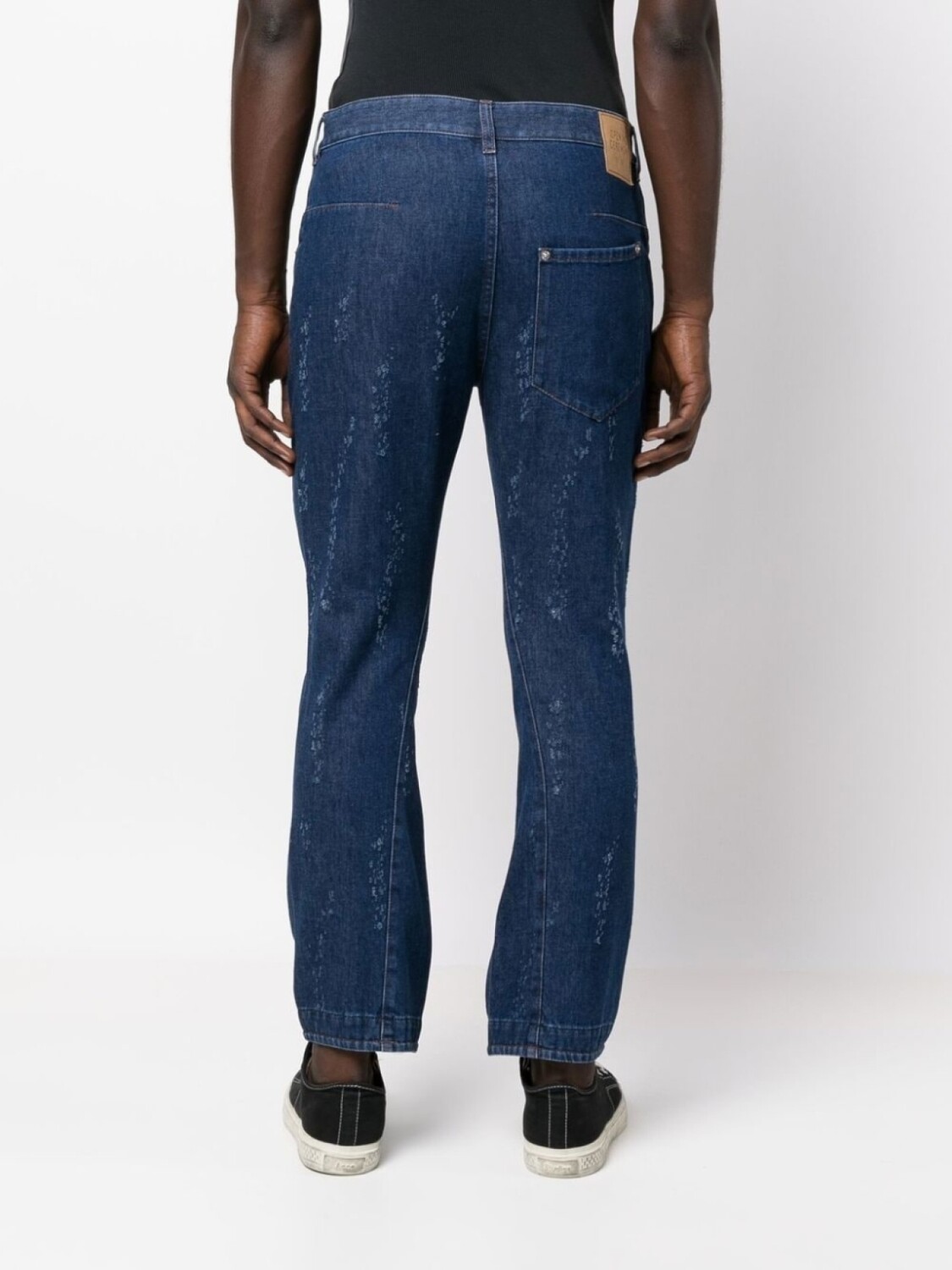 Индиго, смесовый хлопок, модель с прорезями, нашивка с тисненым логотипом сзади, петли для ремня, зауженный крой и застежка на молнии и пуговице спереди.
