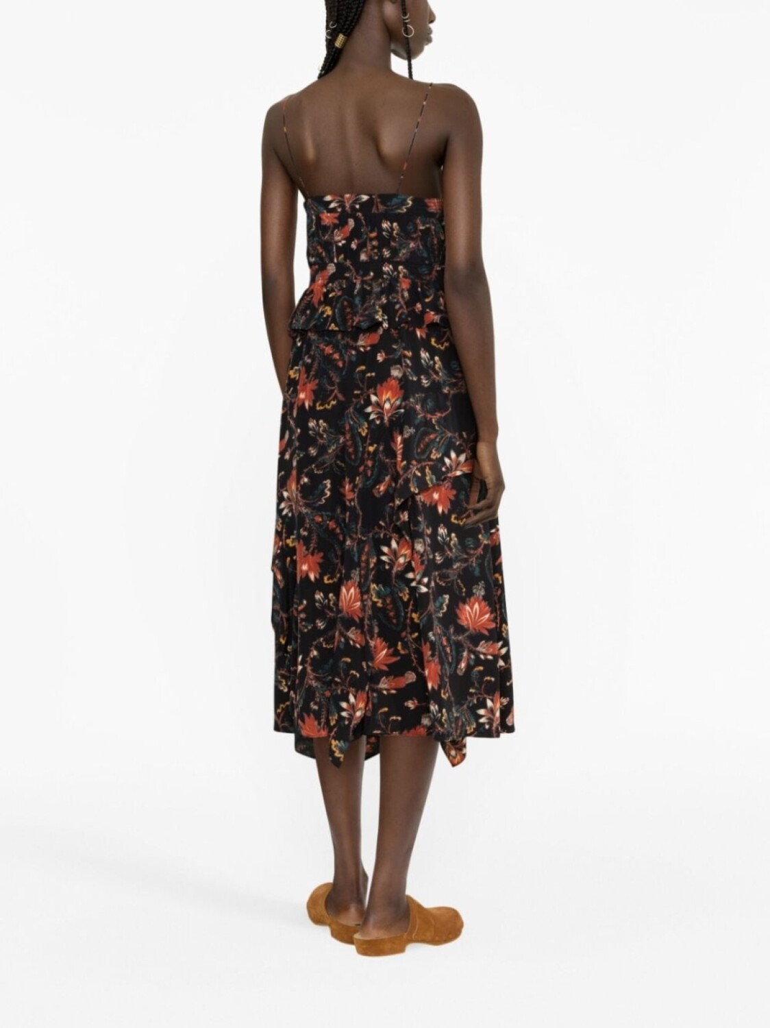 Черный/разноцветный, шелк, сплошной цветочный принт, вырезные детали, V-образный вырез, потайная застежка на молнии сбоку, тонкие бретели и длина миди.