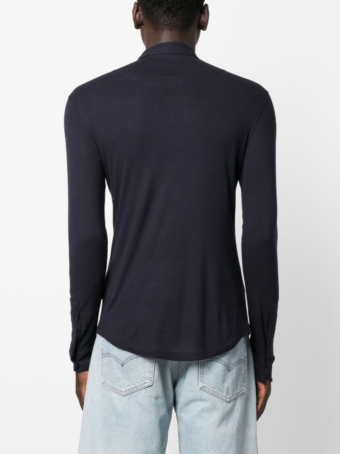 Темно-синий, тонкая вязка, воротник поло, планка на пуговицах спереди, длинные рукава и прямой подол.