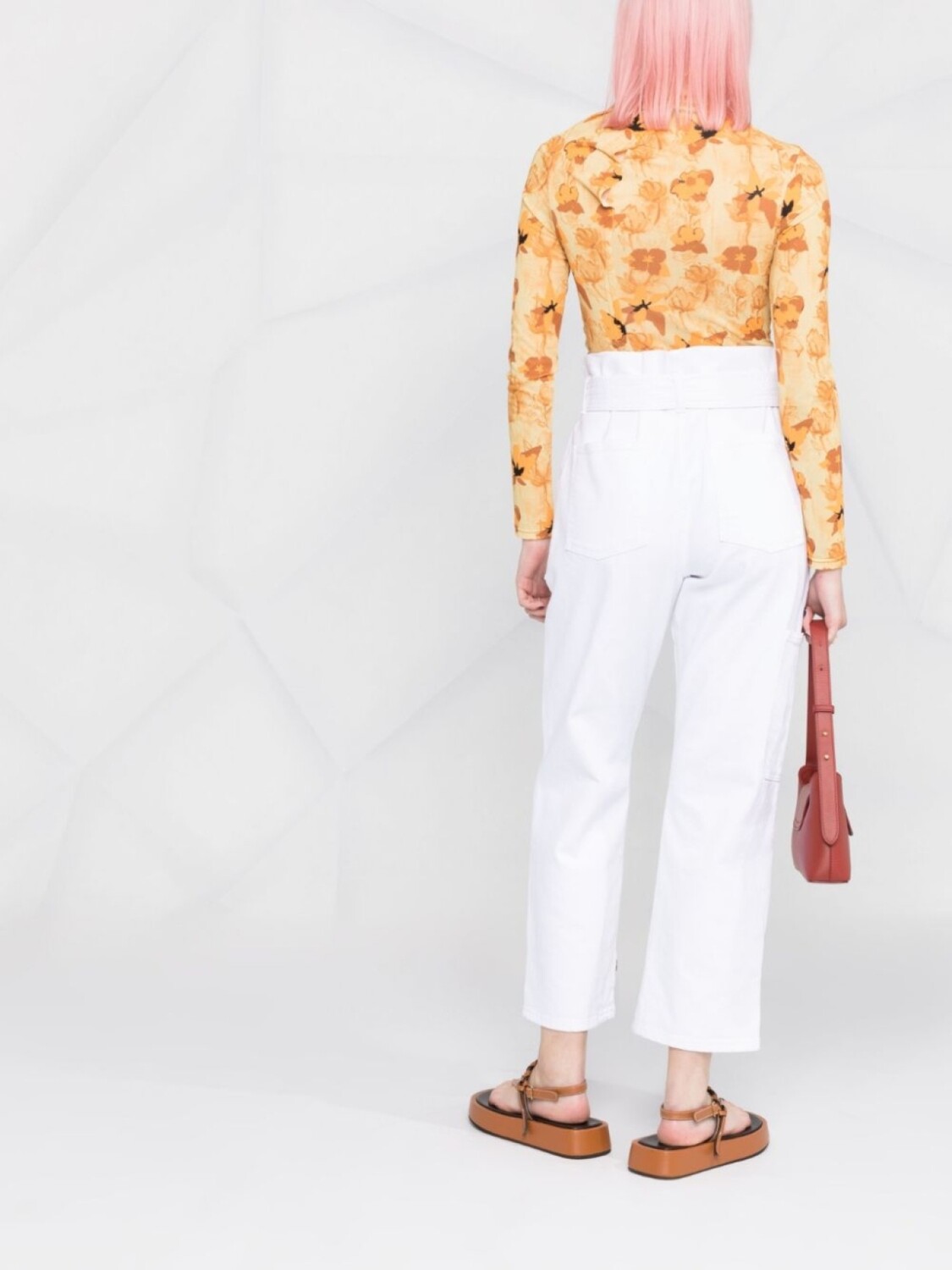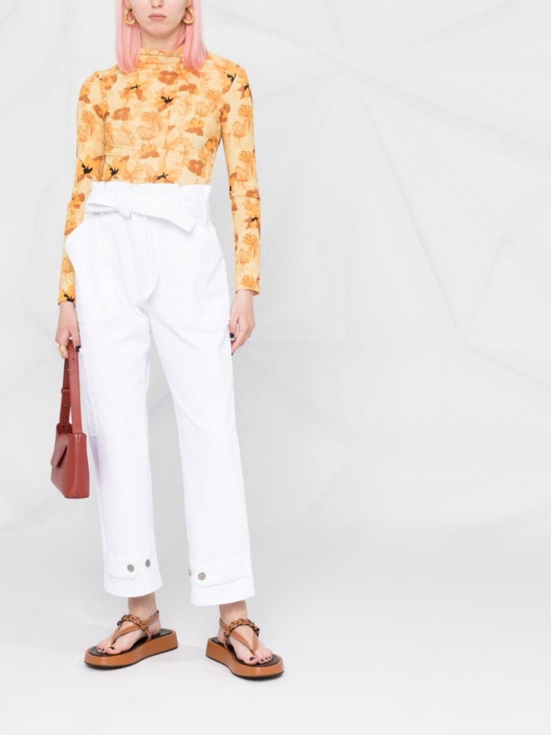 Присборенная талия, ремень на талии, прямой крой, застежка на пуговицах спереди и два прорезных кармана по бокам. Цвет: белый.