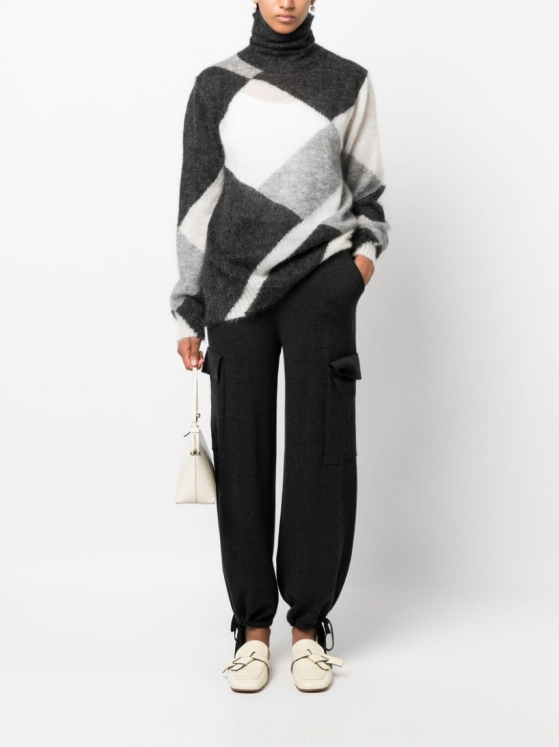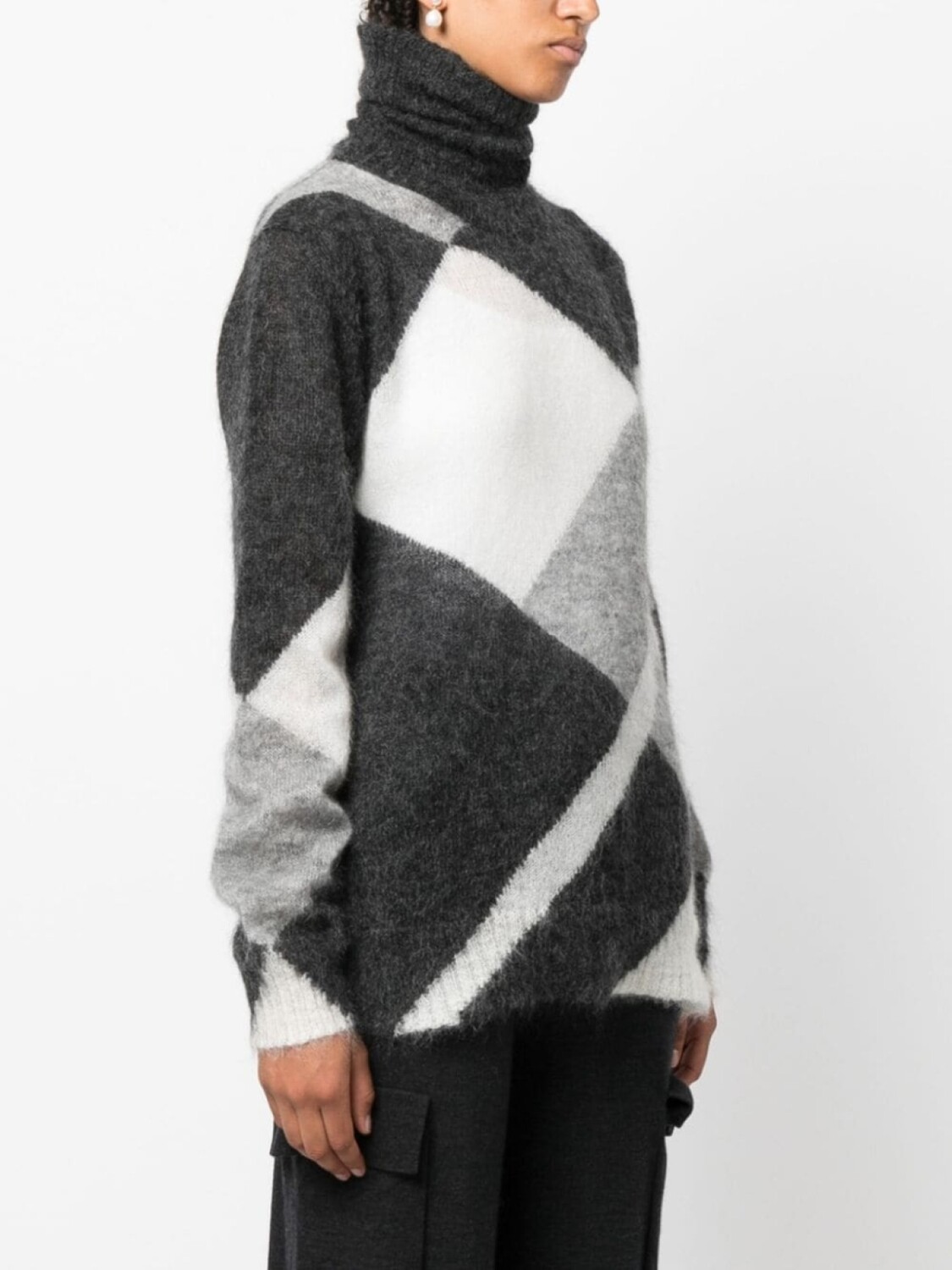 Серый/белый, смесовый мохер, трикотажный материал, матовый эффект, дизайн колор-блок, высокий воротник и длинные рукава.