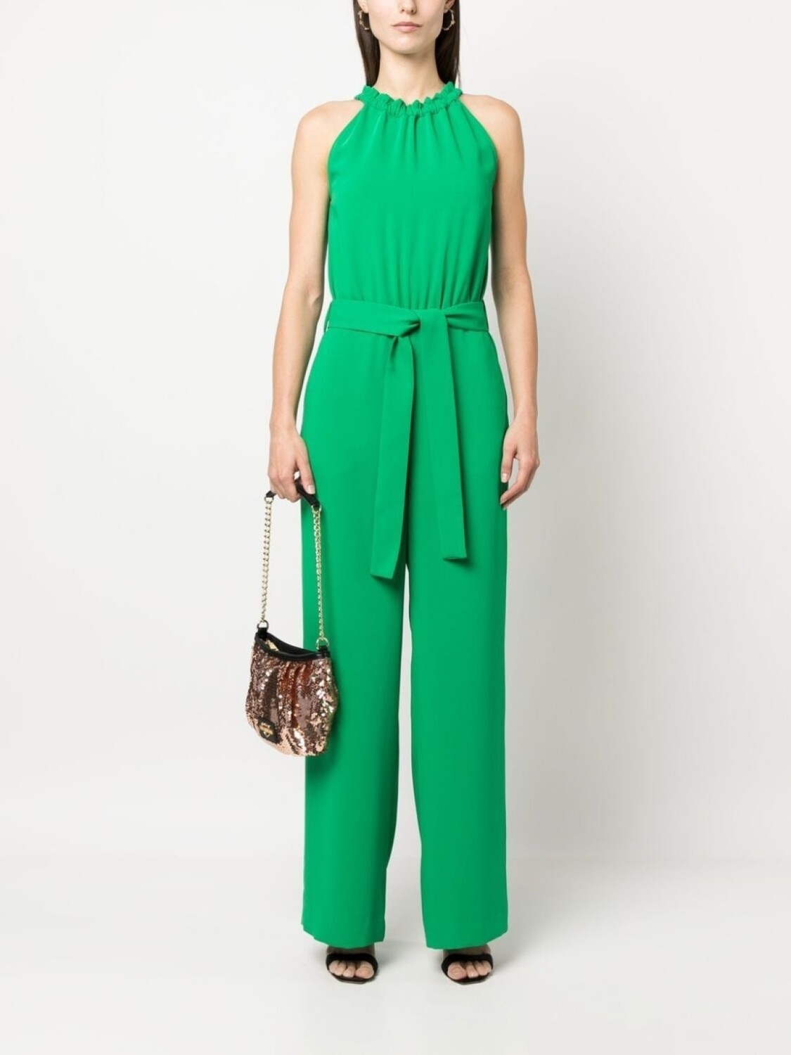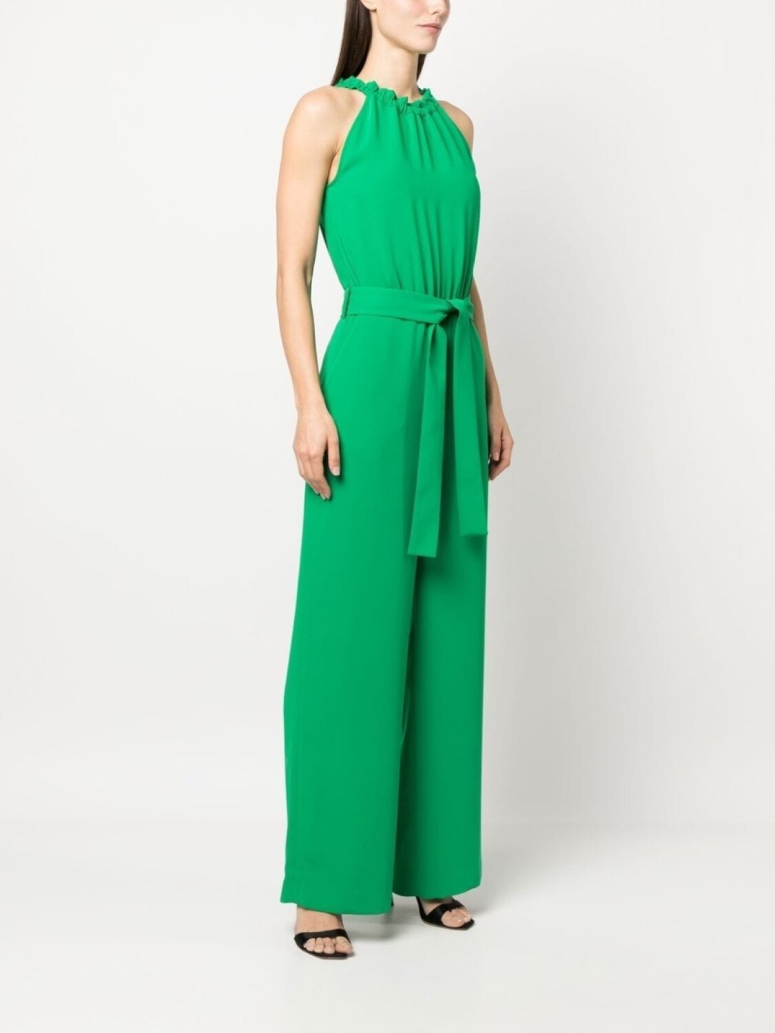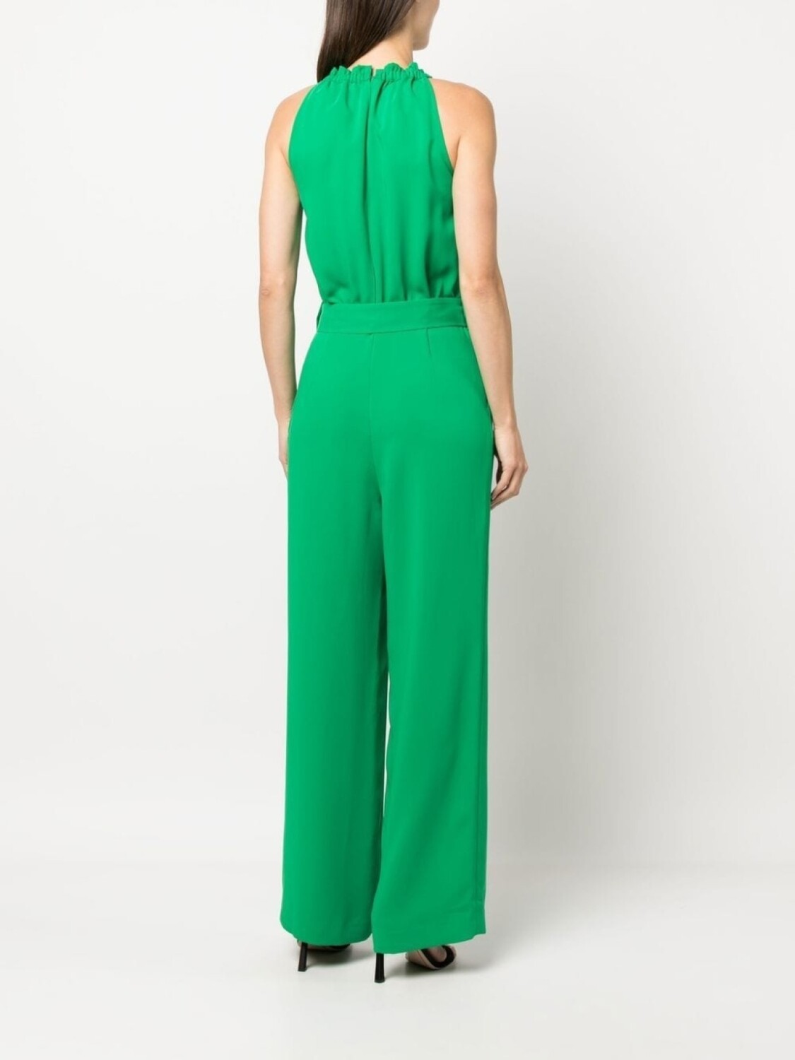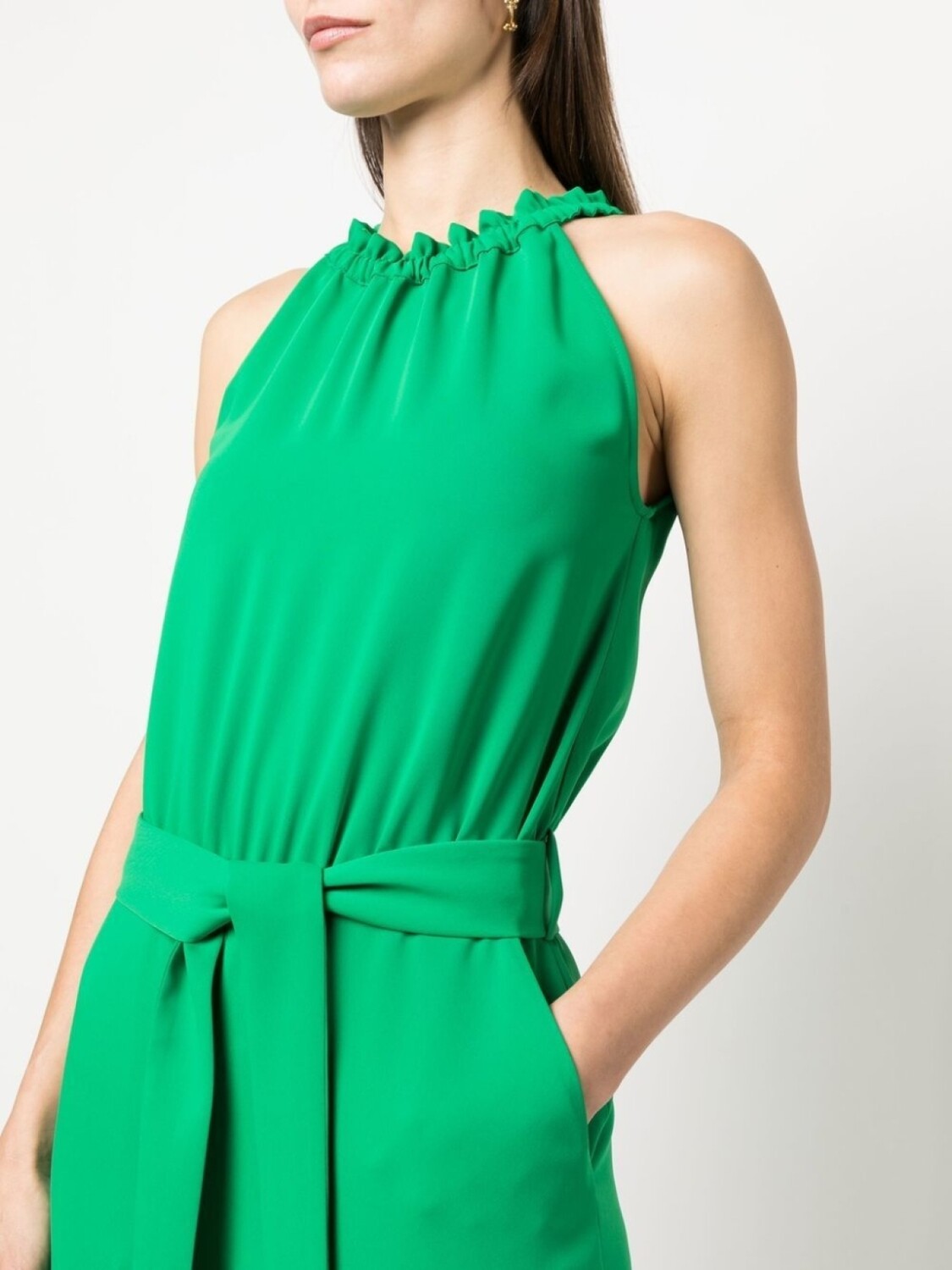 Изумрудно-зеленый, креповая текстура, складки, вырез-петля халтер, ремень на талии и широкий крой.