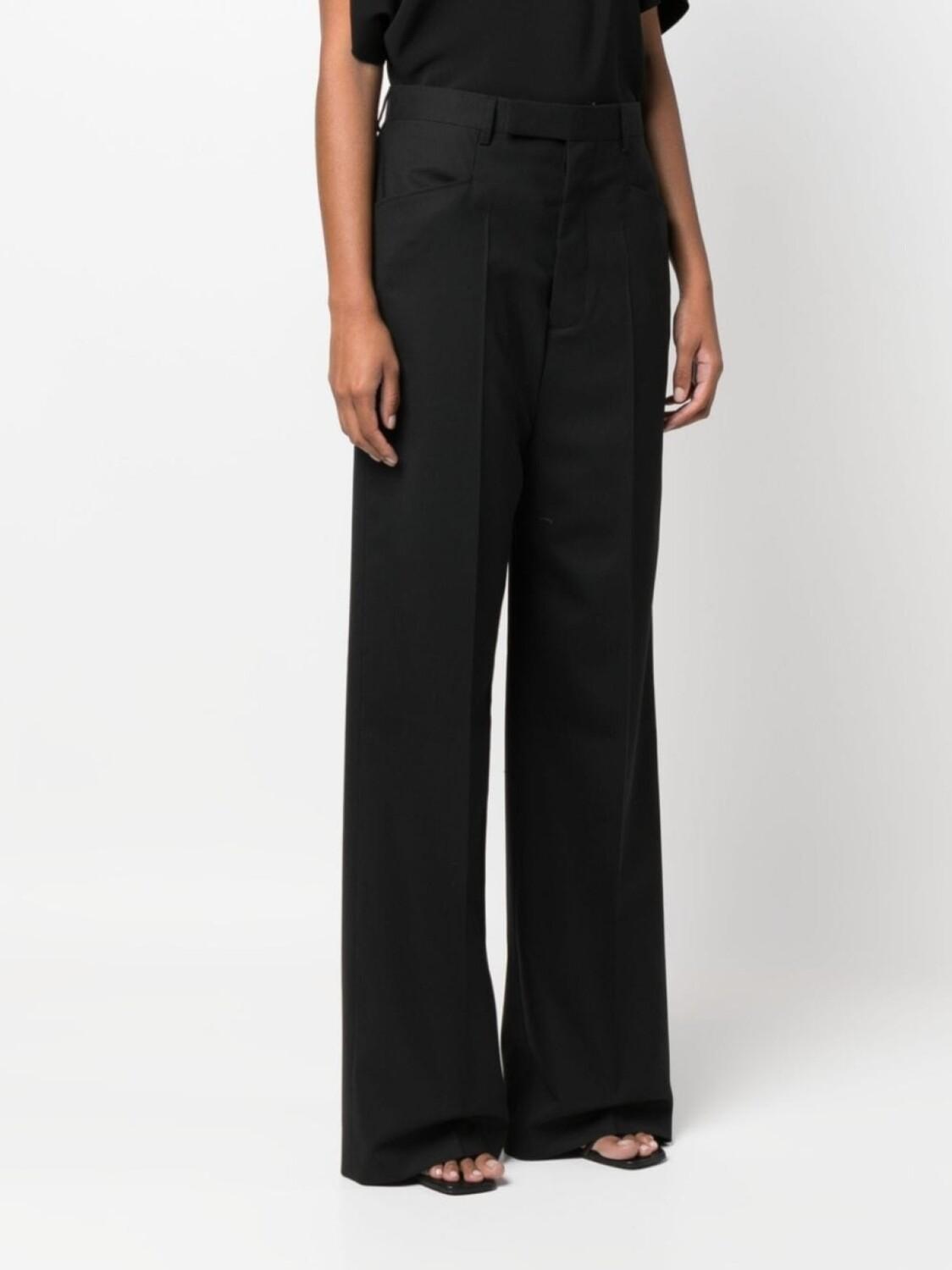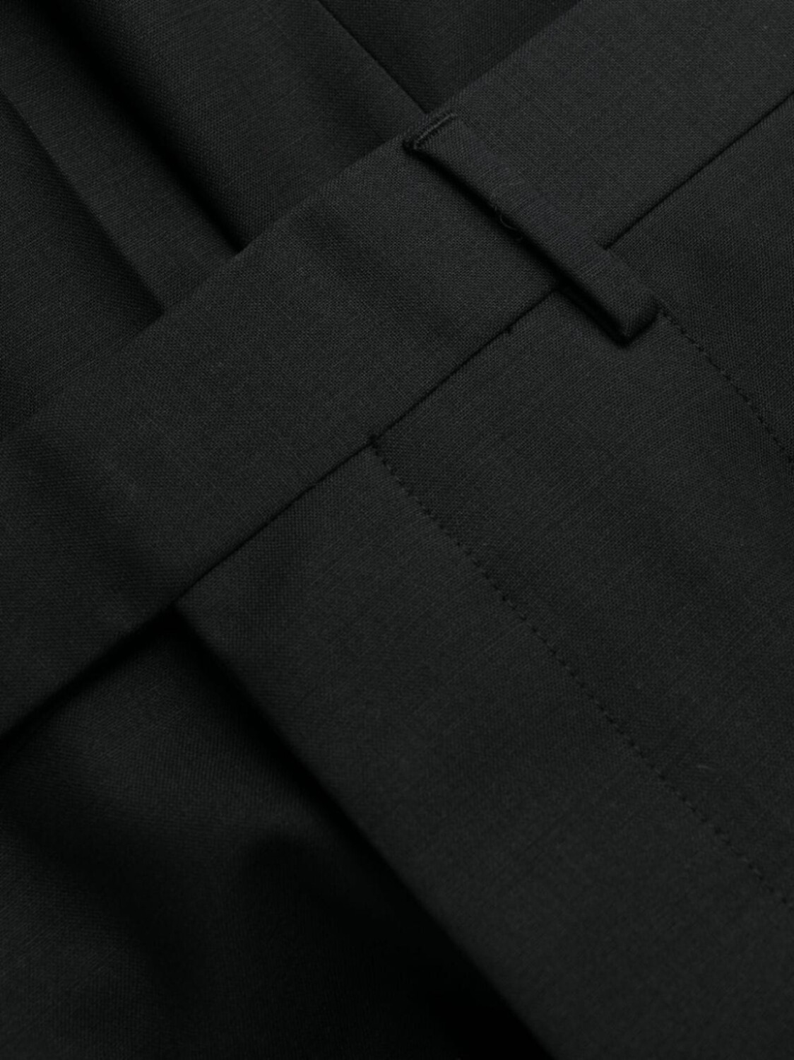Черный, необработанная шерсть, строгий крой, прямой крой, средняя посадка, потайная застежка спереди, петли для ремня, два прорезных кармана по бокам, два кармана на пуговице сзади и стрелки.