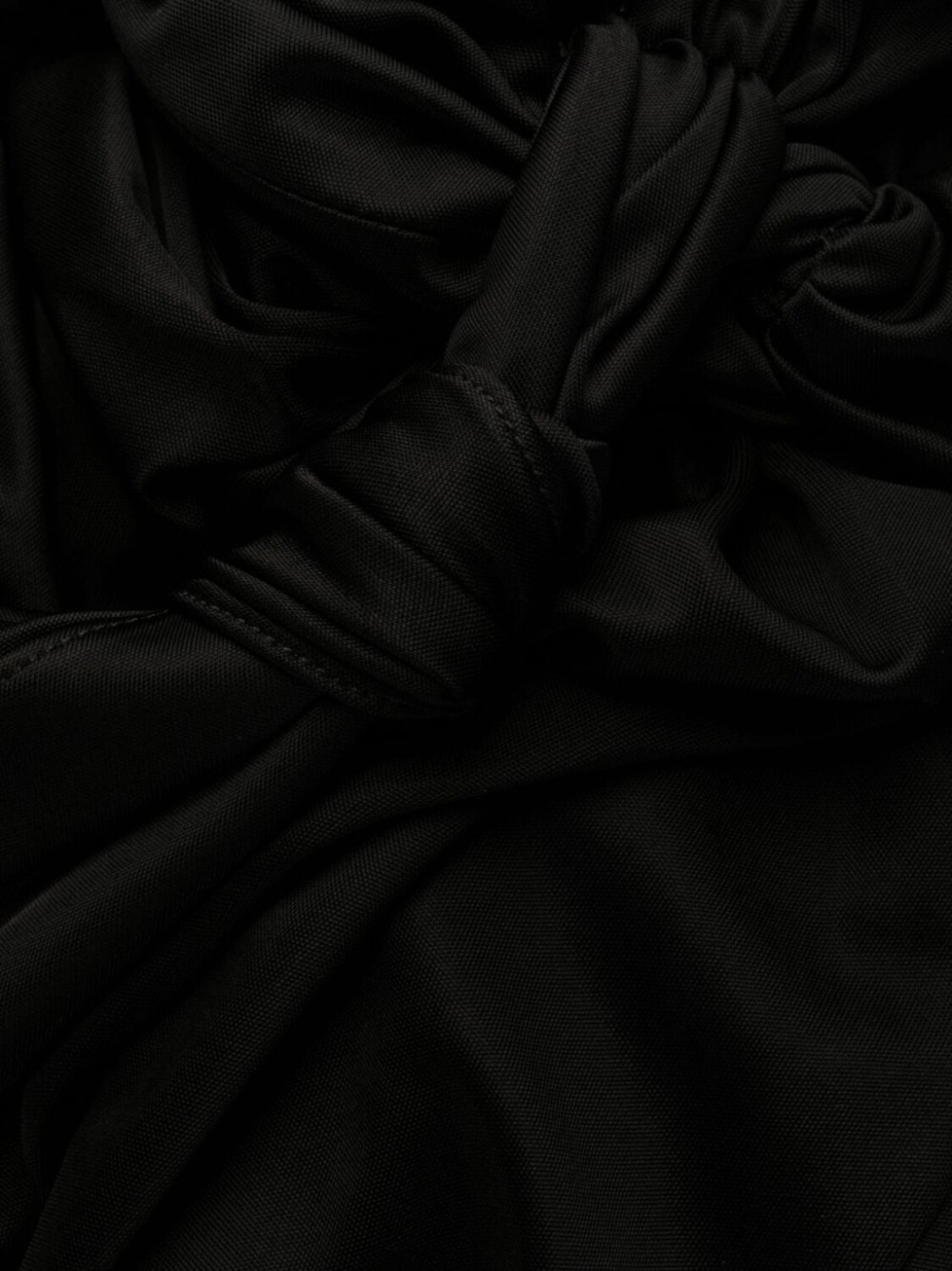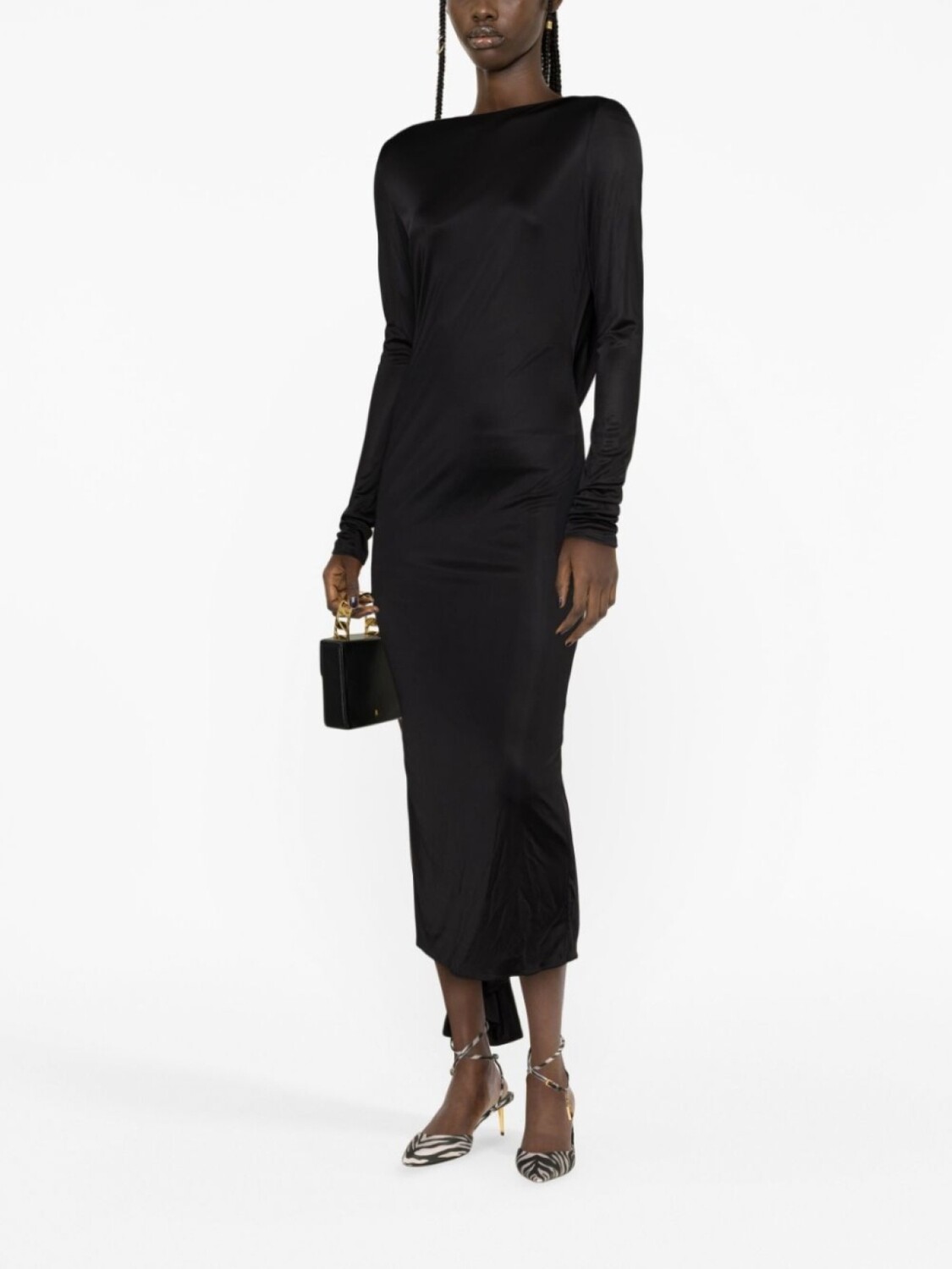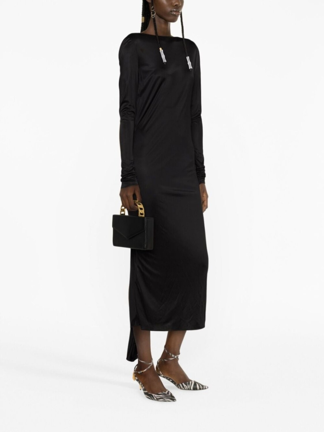 Черный, декор в виде узла, драпировка, вырез-лодочка, без задника, длинные рукава и длинная модель.