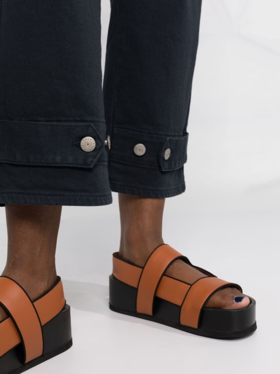 Присборенная талия, укороченная длина, ремень на талии, застежка на пуговицах спереди и два кармана по бокам.