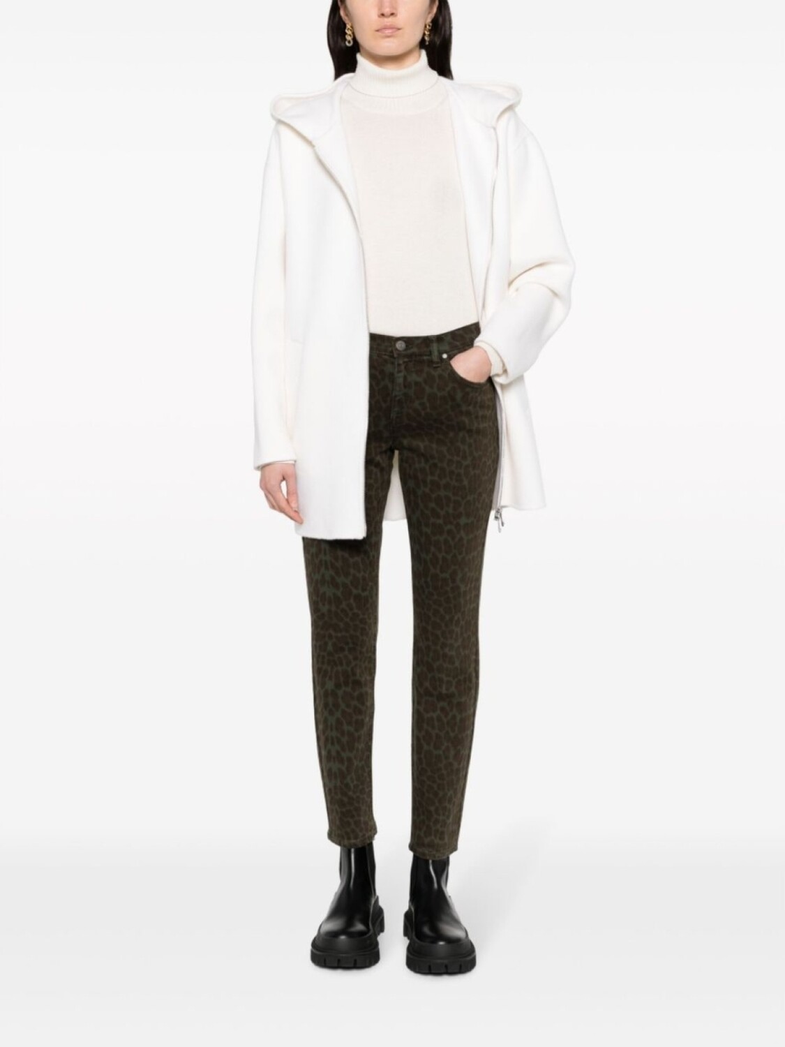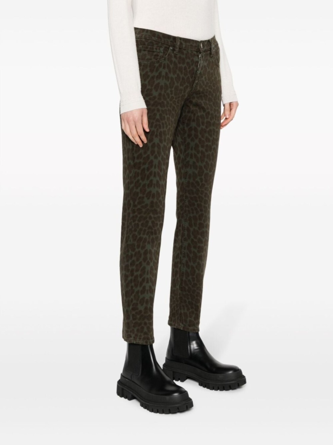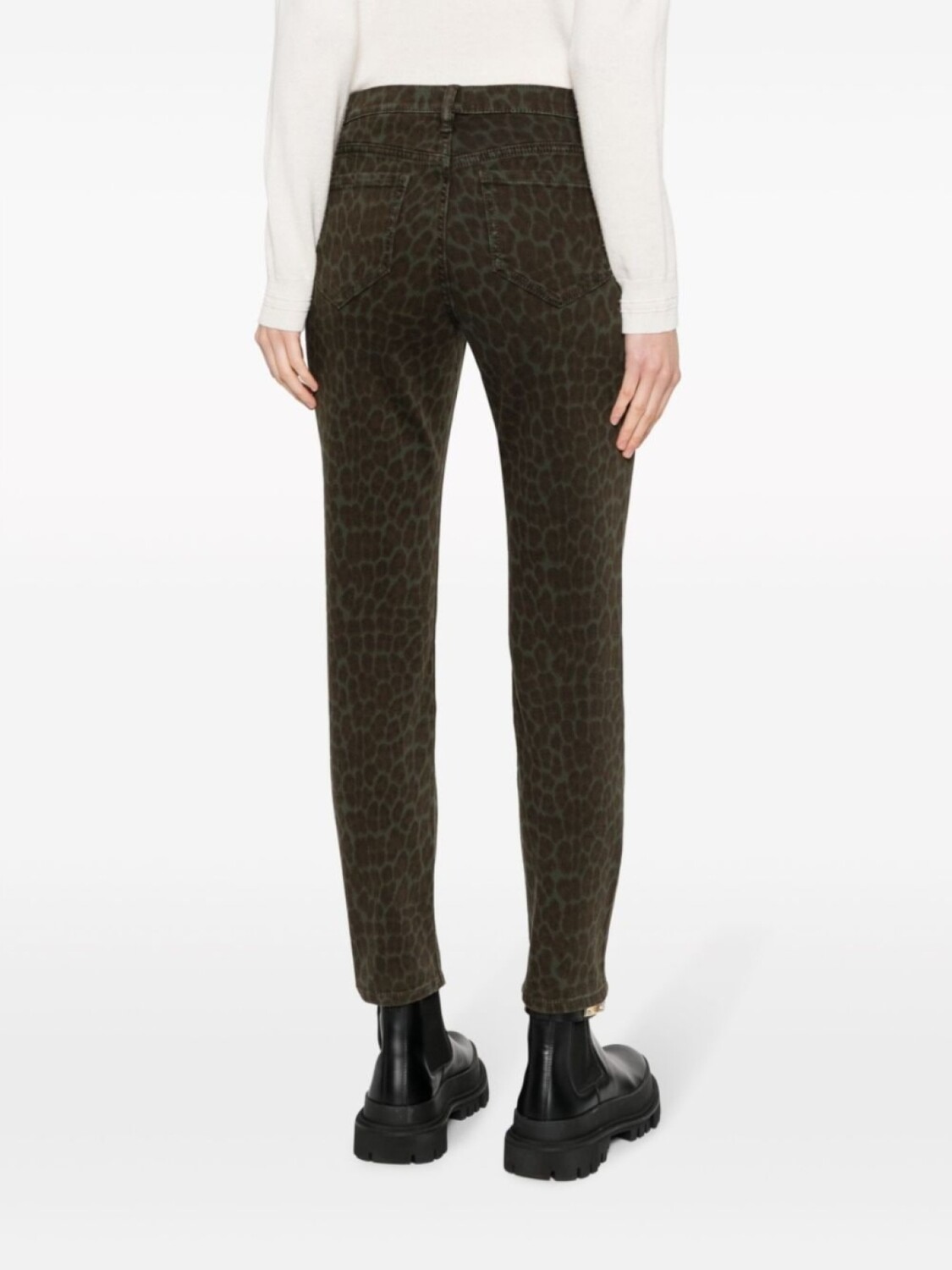 Темно-зеленый, оливково-зеленый, эластичный хлопок, сплошной леопардовый принт, строчка в тон, средняя посадка, петли для ремня, потайная застежка на молнии и пуговицах, пять карманов, укороченная длина и узкий крой.