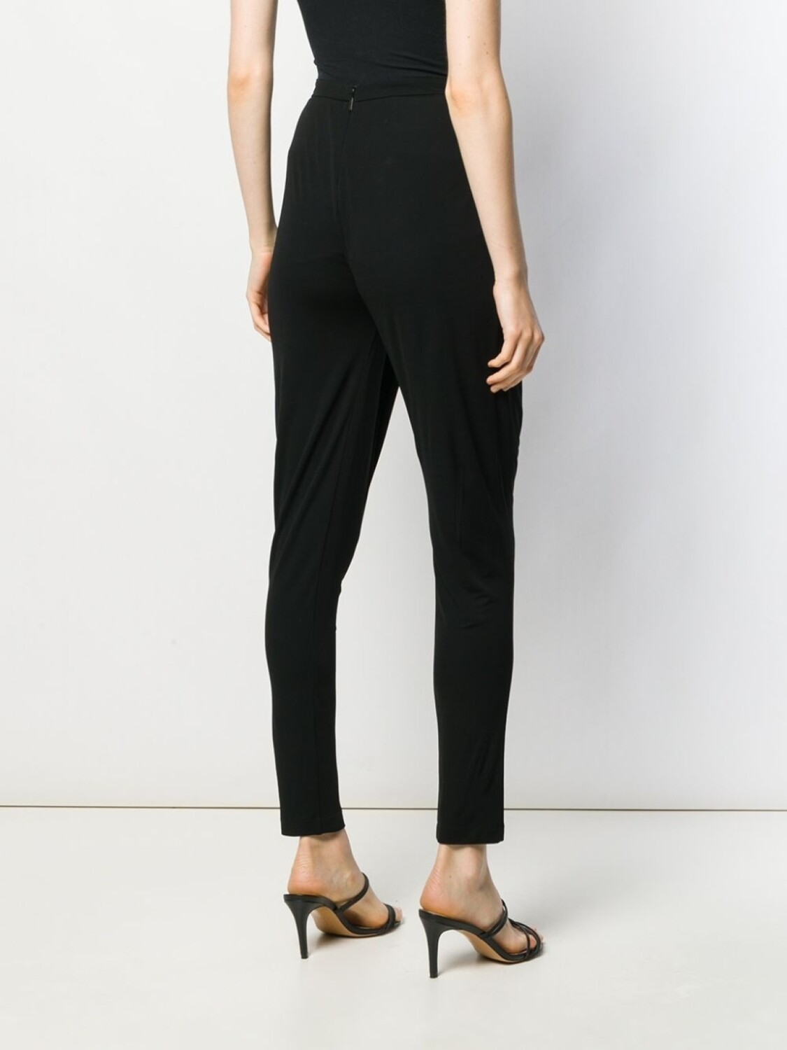 Черный, завышенная талия, застежка на молнии сзади, вставки и узкий крой.