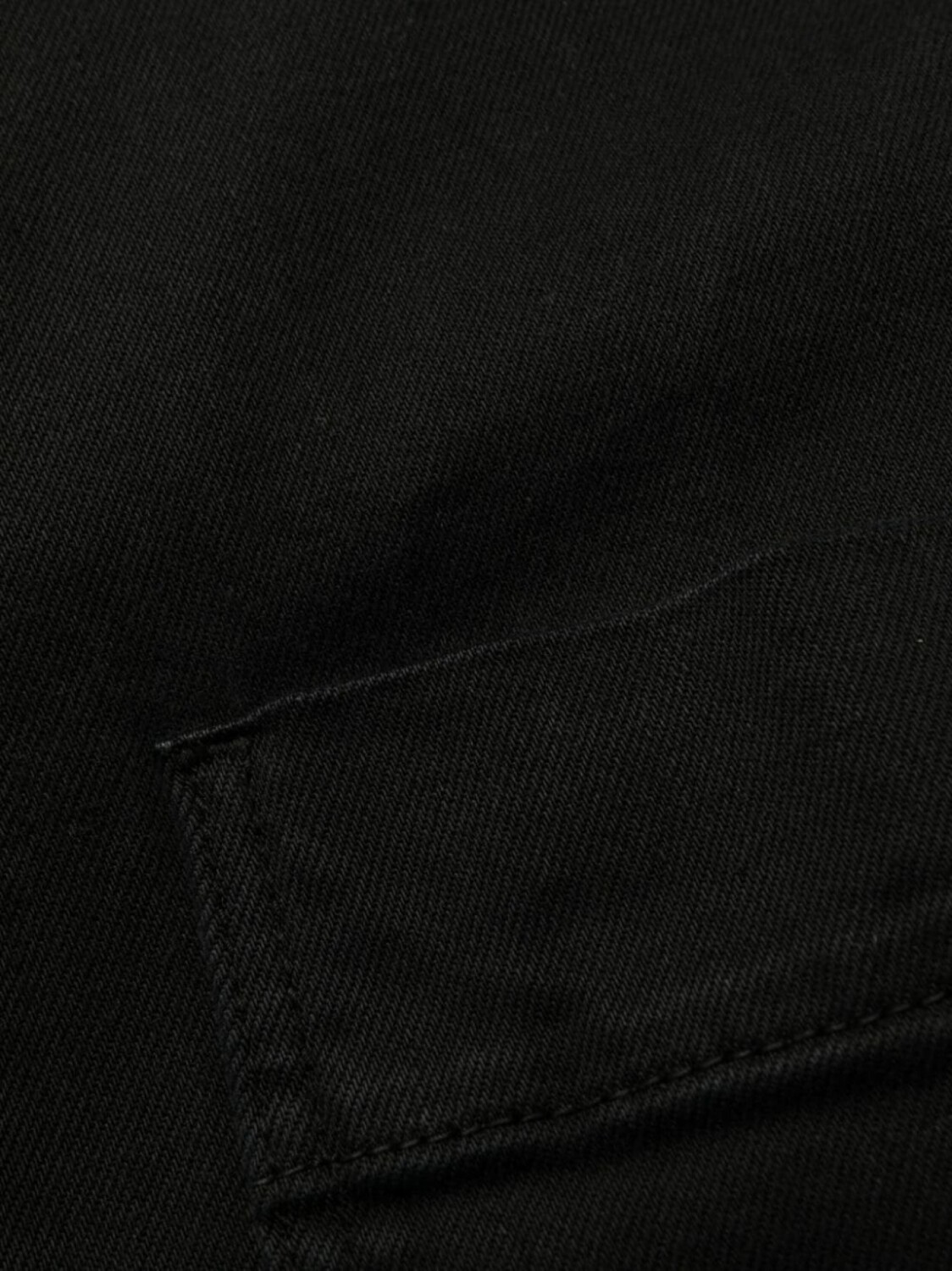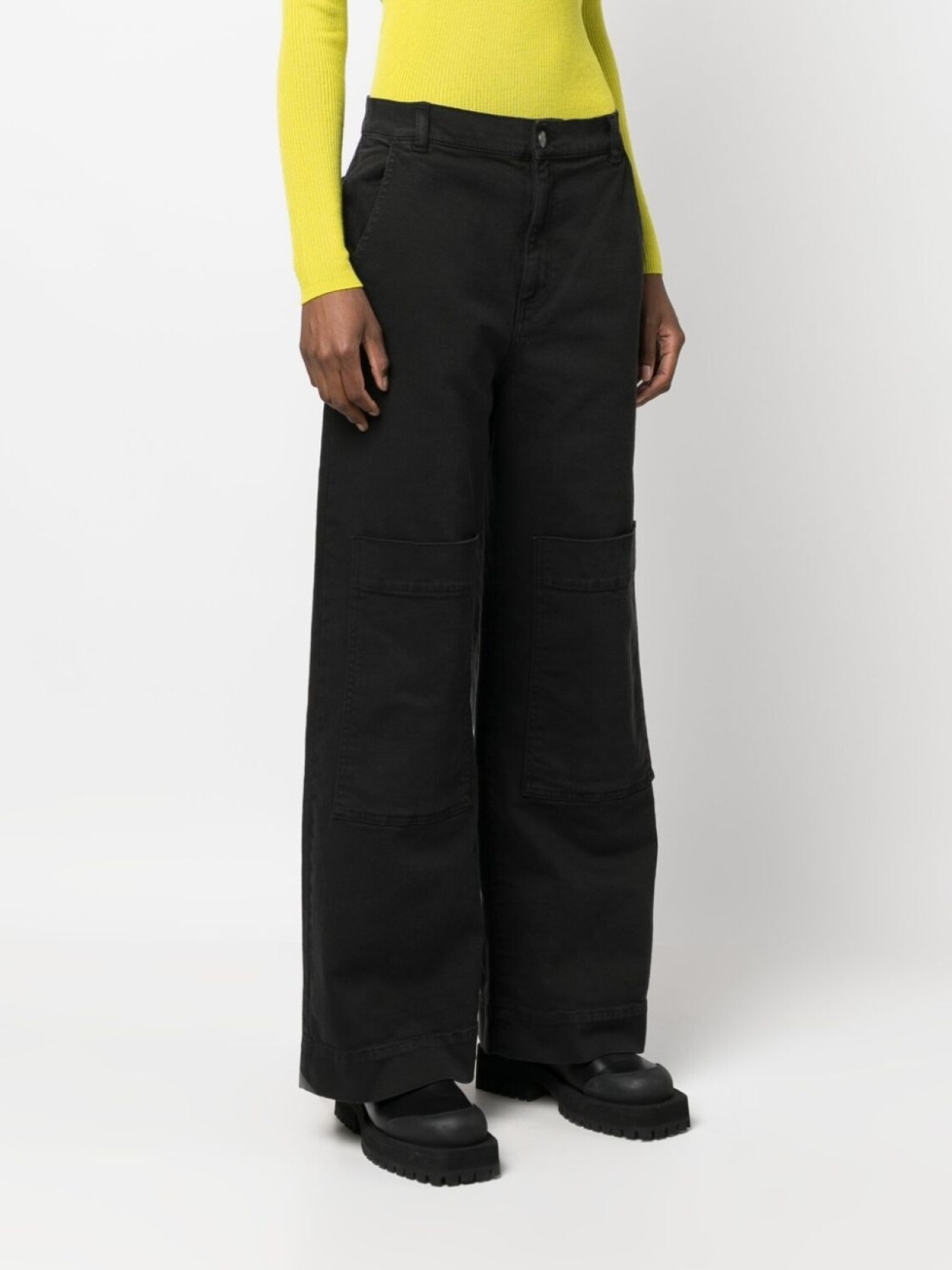 Черный, эластичный хлопок, деним, строчка в тон, петли для ремня, ширинка на пуговицах, низкая посадка, широкий крой, два кармана по бокам, два накладных кармана сзади, два накладных кармана спереди и прямой подол.