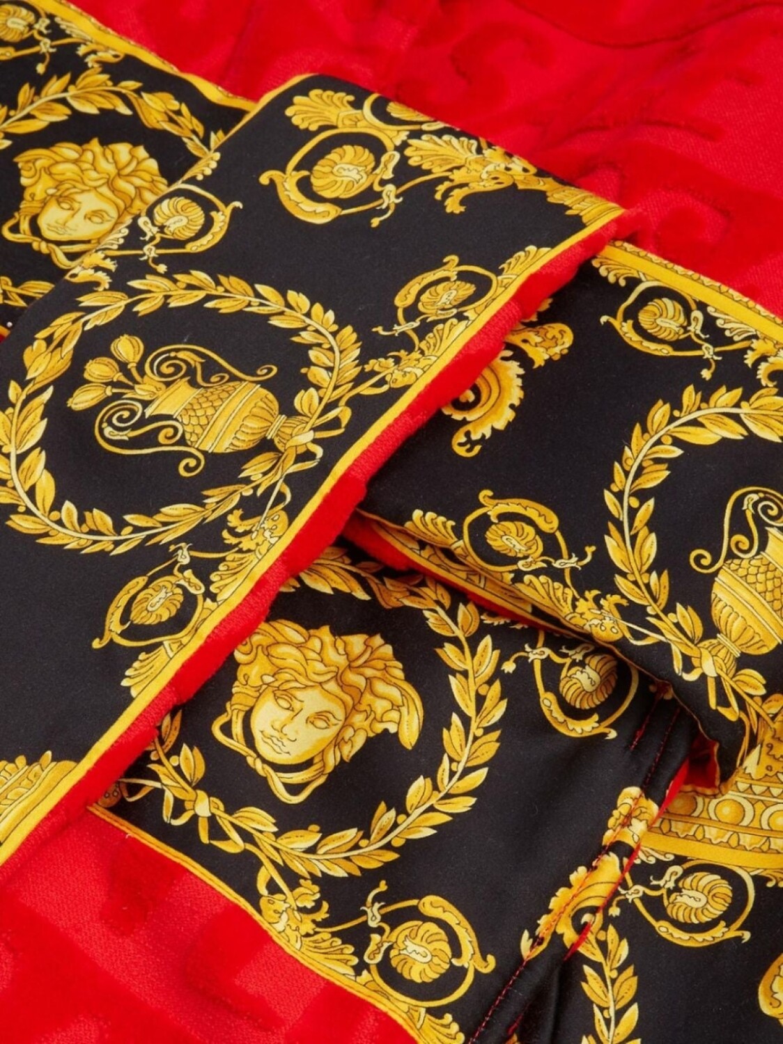 Ярко-красный, черный, желтое золото, хлопок, принт Regalia Baroque, жаккардовый логотип, лацканы-шалька, два накладных кармана спереди, застежка на узел, длинные рукава и прямой подол. Это унисекс-модель. Обратите внимание, что для нее используется мужская размерная сетка.