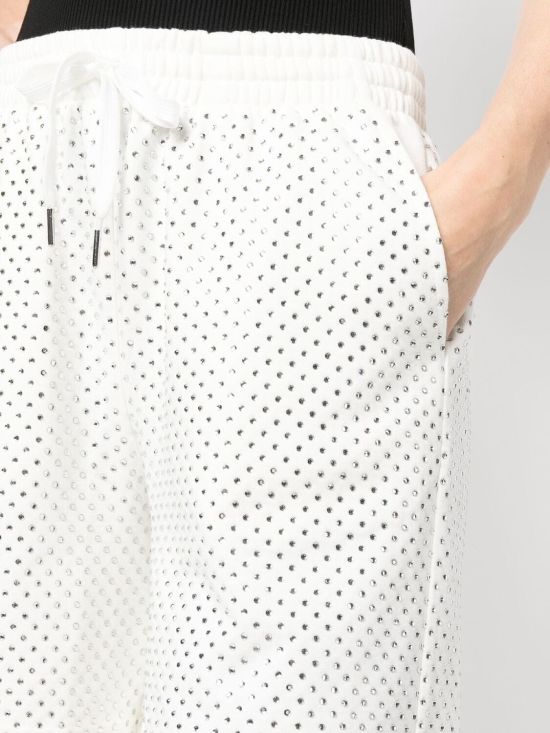 Белый, смесовый хлопок, украшения из горного хрусталя, эластичный пояс, кулиска на талии, два прорезных кармана по бокам и длина до бедер.