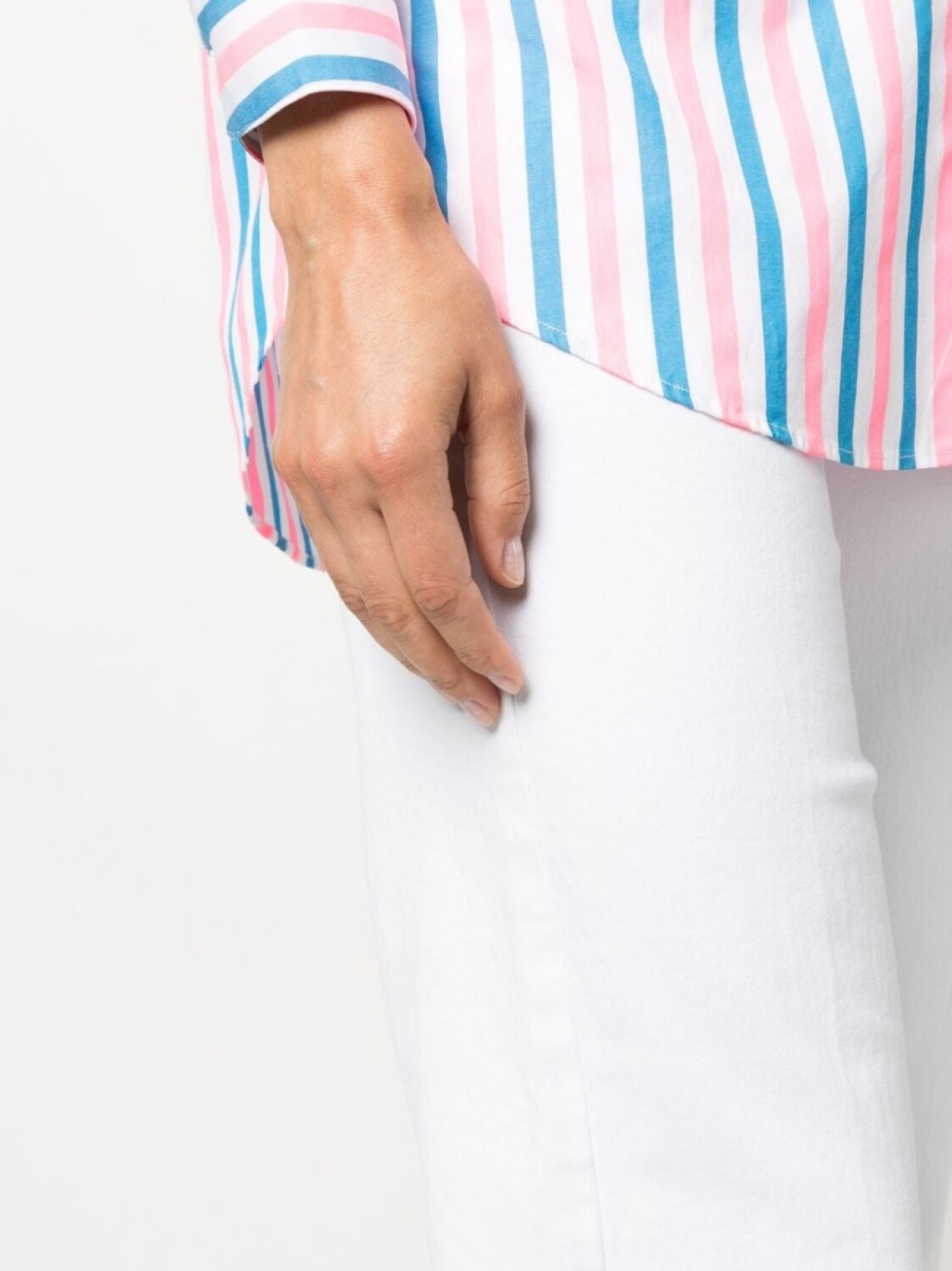 Белый, эластичный хлопок, нашивка с логотипом сзади, средняя посадка, прямой крой, стрелки, петли для ремня, застежка на молнии и пуговице спереди и пять карманов.