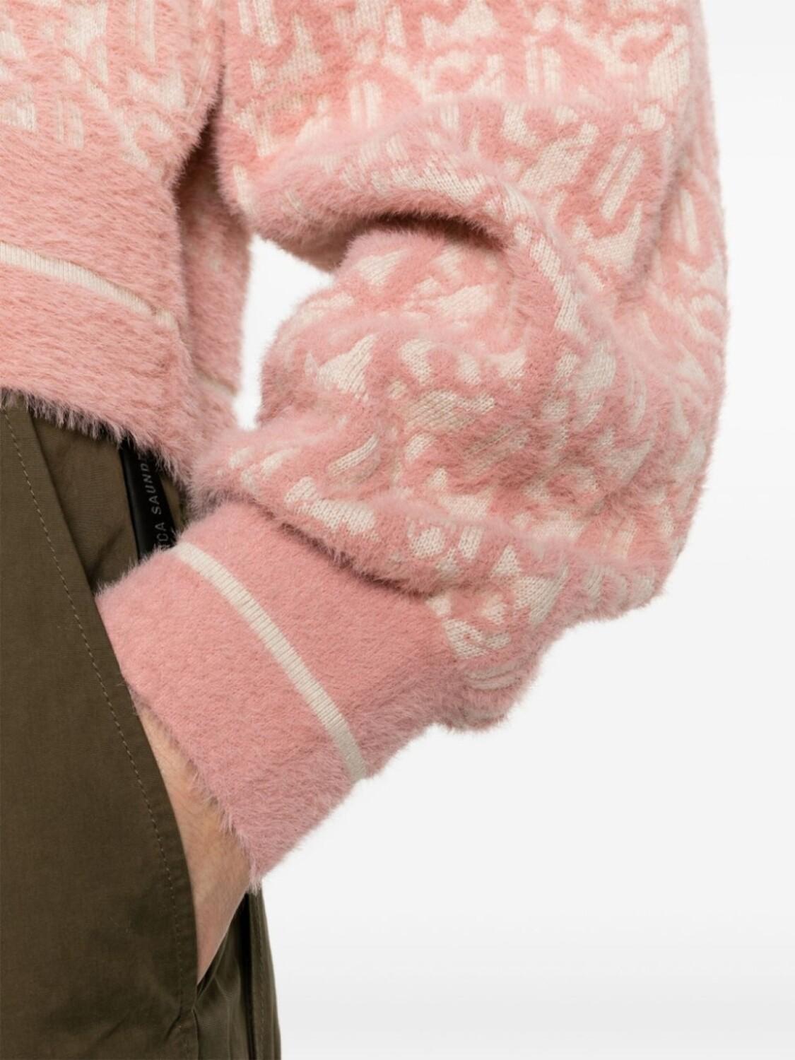 Расцветка Blush Pink, трикотажный материал, жаккард с монограммой, полосатые края, круглый вырез, длинные рукава и прямой подол.