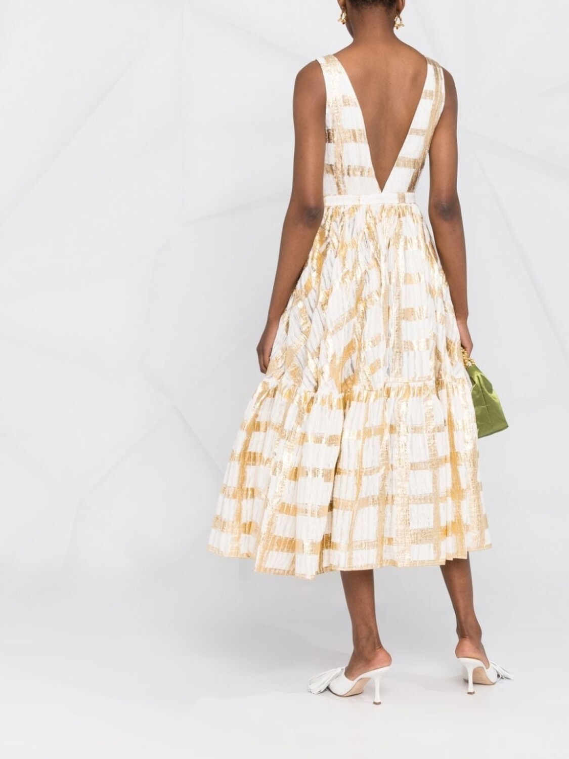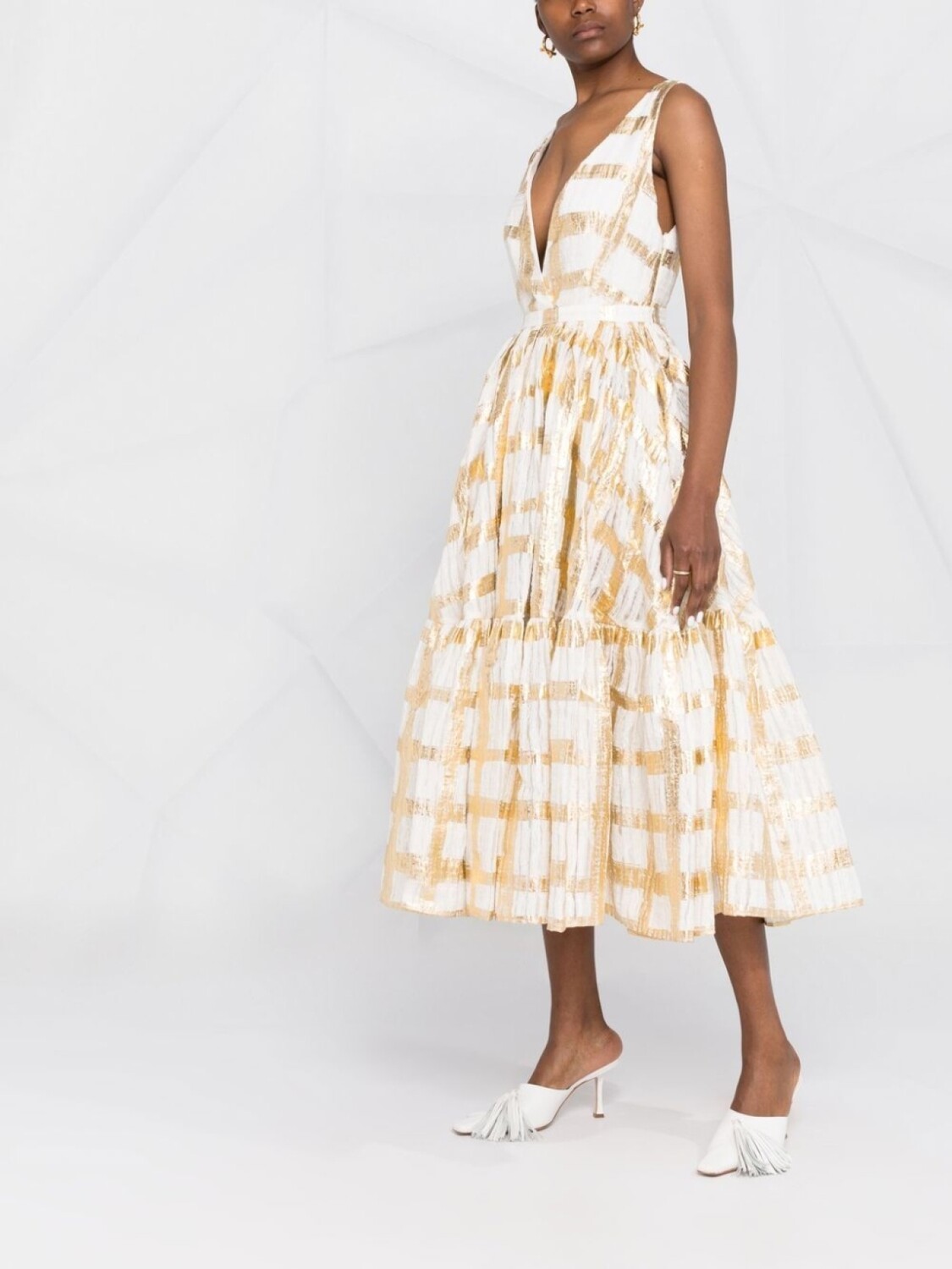 Золотистый, белый, клетчатый узор, эффект металлик, V-образный вырез, без рукавов, застежка на молнии сбоку, расклешенная юбка, ярусная юбка и длина миди.