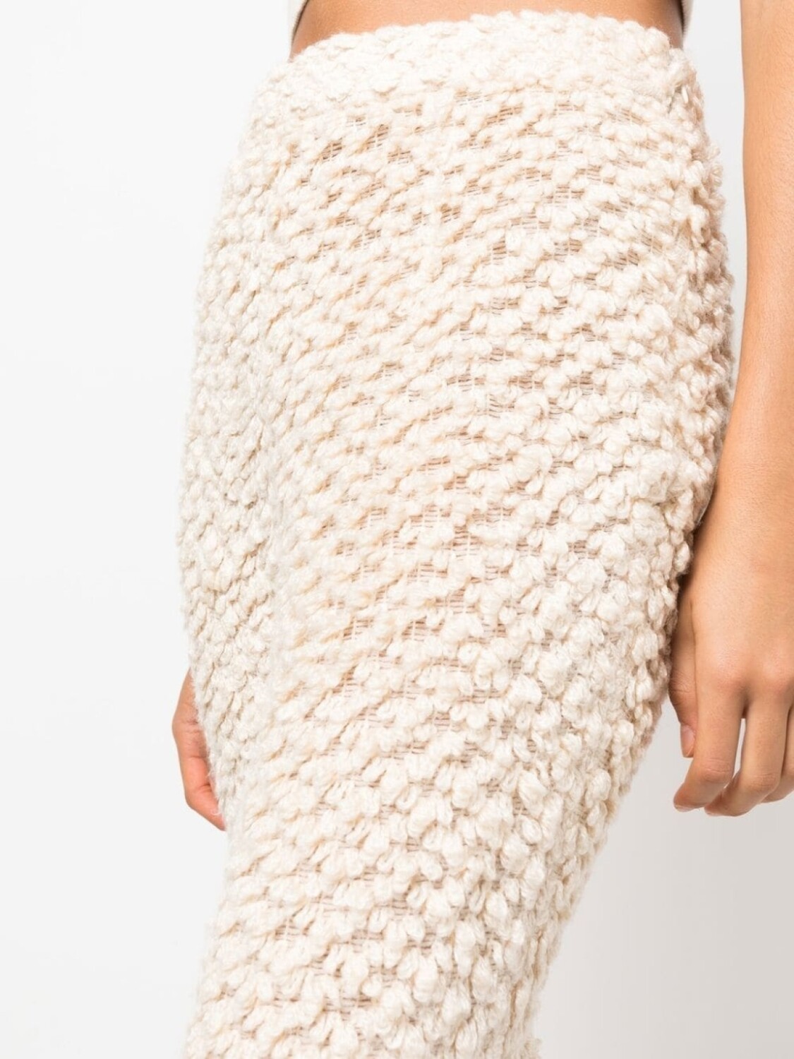 Цвет слоновой кости, крупная вязка, ткань букле, расклешенный крой и средняя посадка.