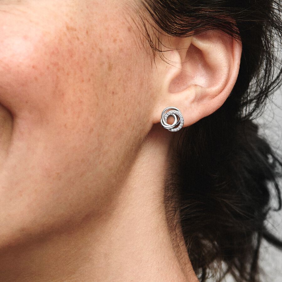 Серьги-гвоздики украшены тремя окружностями − две сделаны из серебра 925 пробы, а третья инкрустирована линией прозрачных кубических циркониев паве. Гармония разных форм символизирует единение членов семьи, несмотря на их различия.