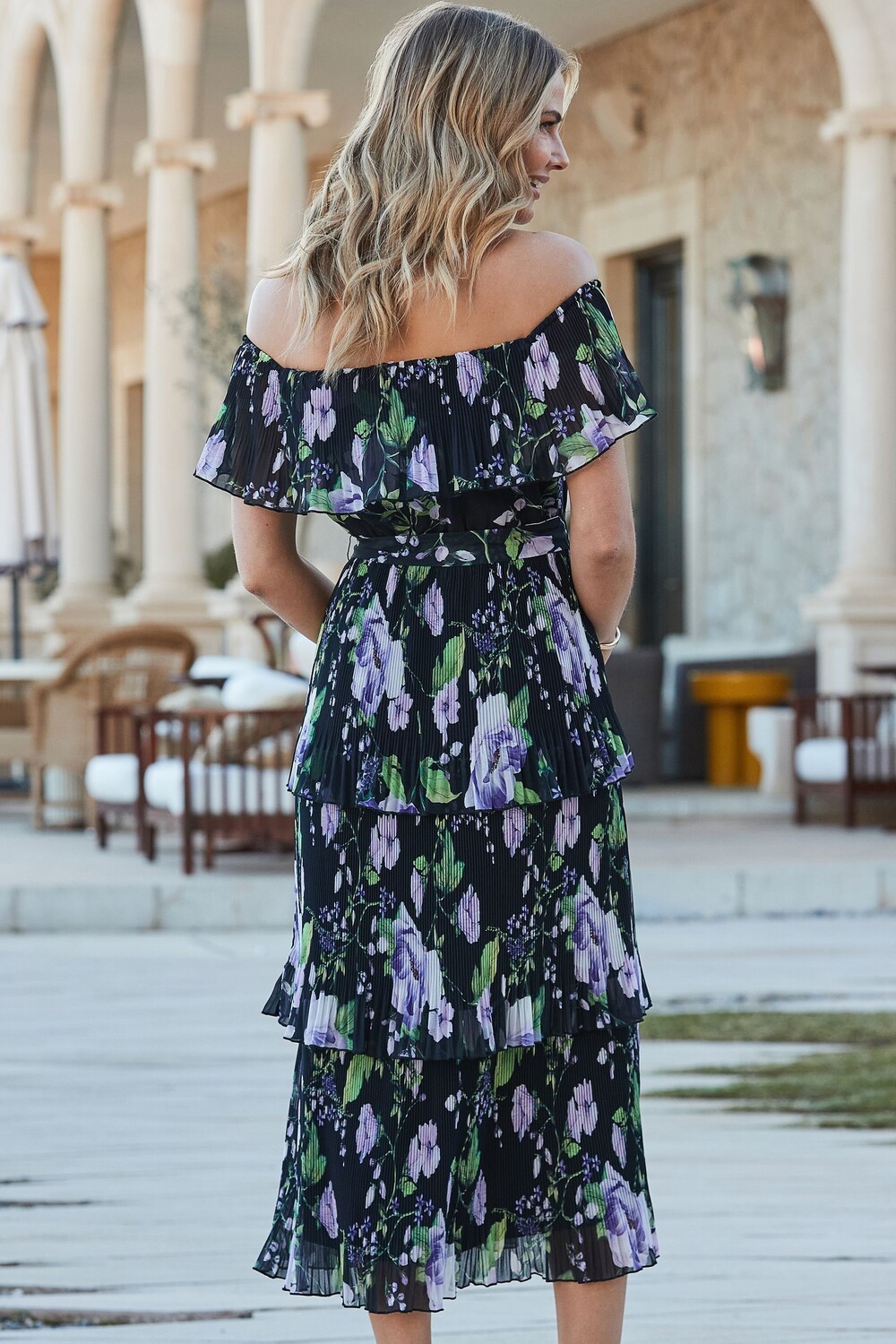 Платье миди с бардо и ярусным подолом с цветочным принтом Sosandar, черный