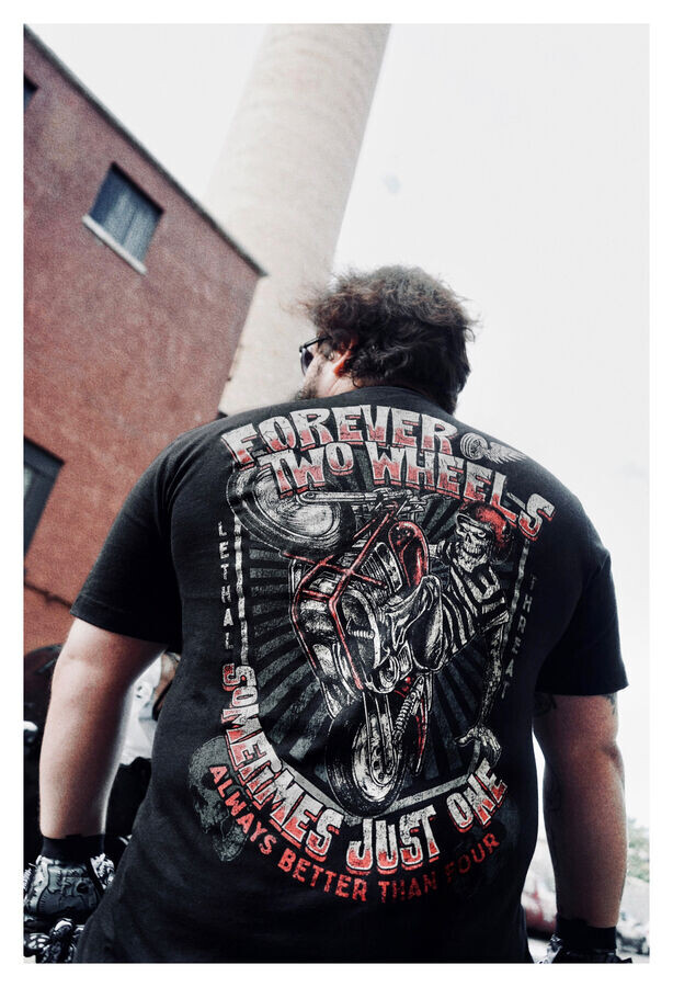 А вот и футболка Wheely от Lethal Threat. «Навсегда два колеса, иногда только одно» — вот твой байкерский девиз. . Хороший выбор, так что вы можете показать его всем особенно те, кто позади тебя!